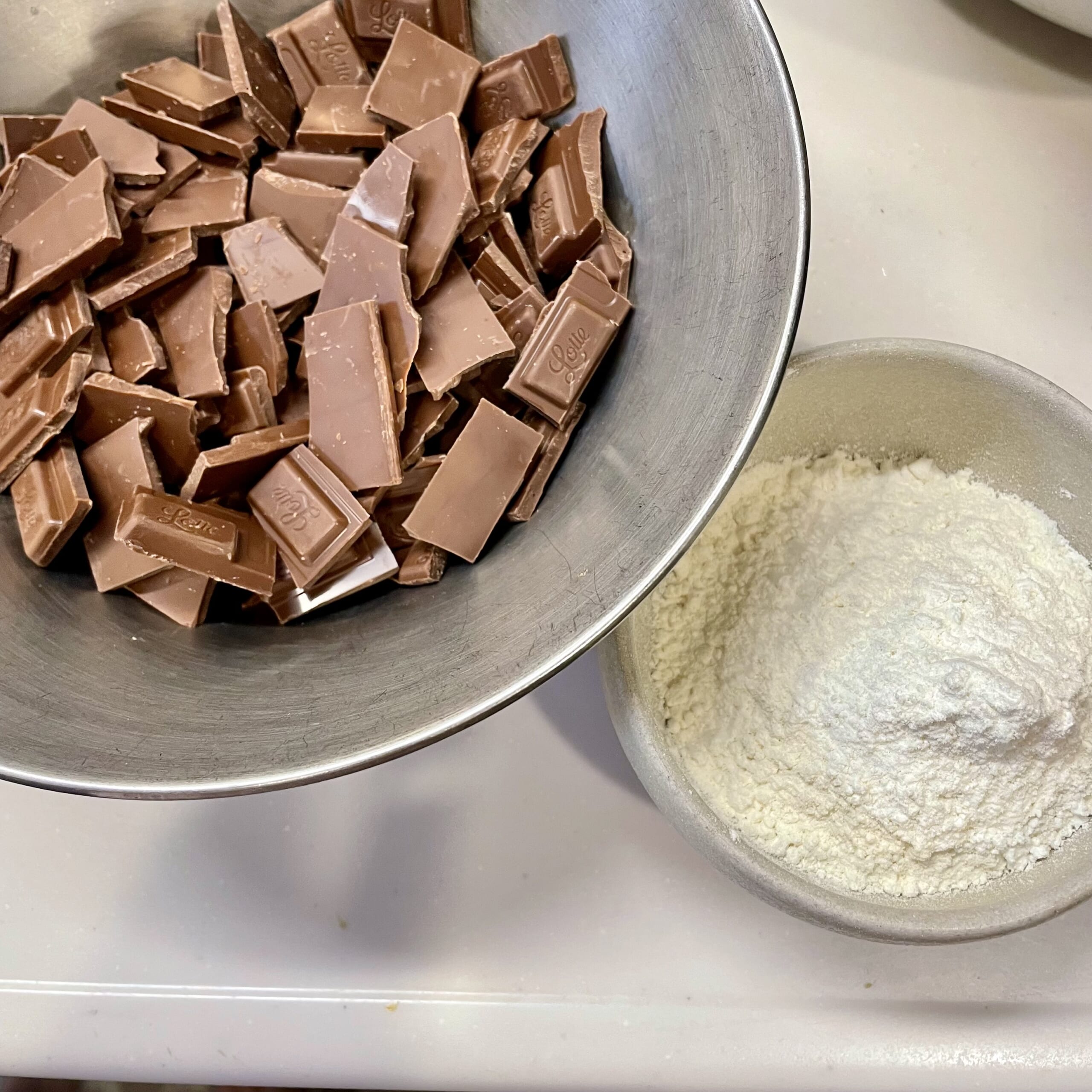 あとは、チョコレートを湯煎して、薄力粉を混ぜるだけ。