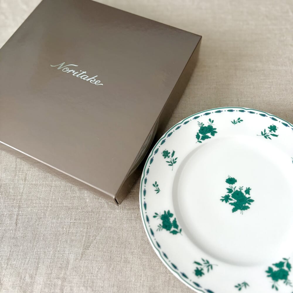 それは深いグリーンの小花柄があしらわれた、ヴィンテージ感のあるケーキ皿で、日本を代表する世界的テーブルウェアブランド「Noritake(ノリタケ)」の復刻デザインが取り入れられたもの。