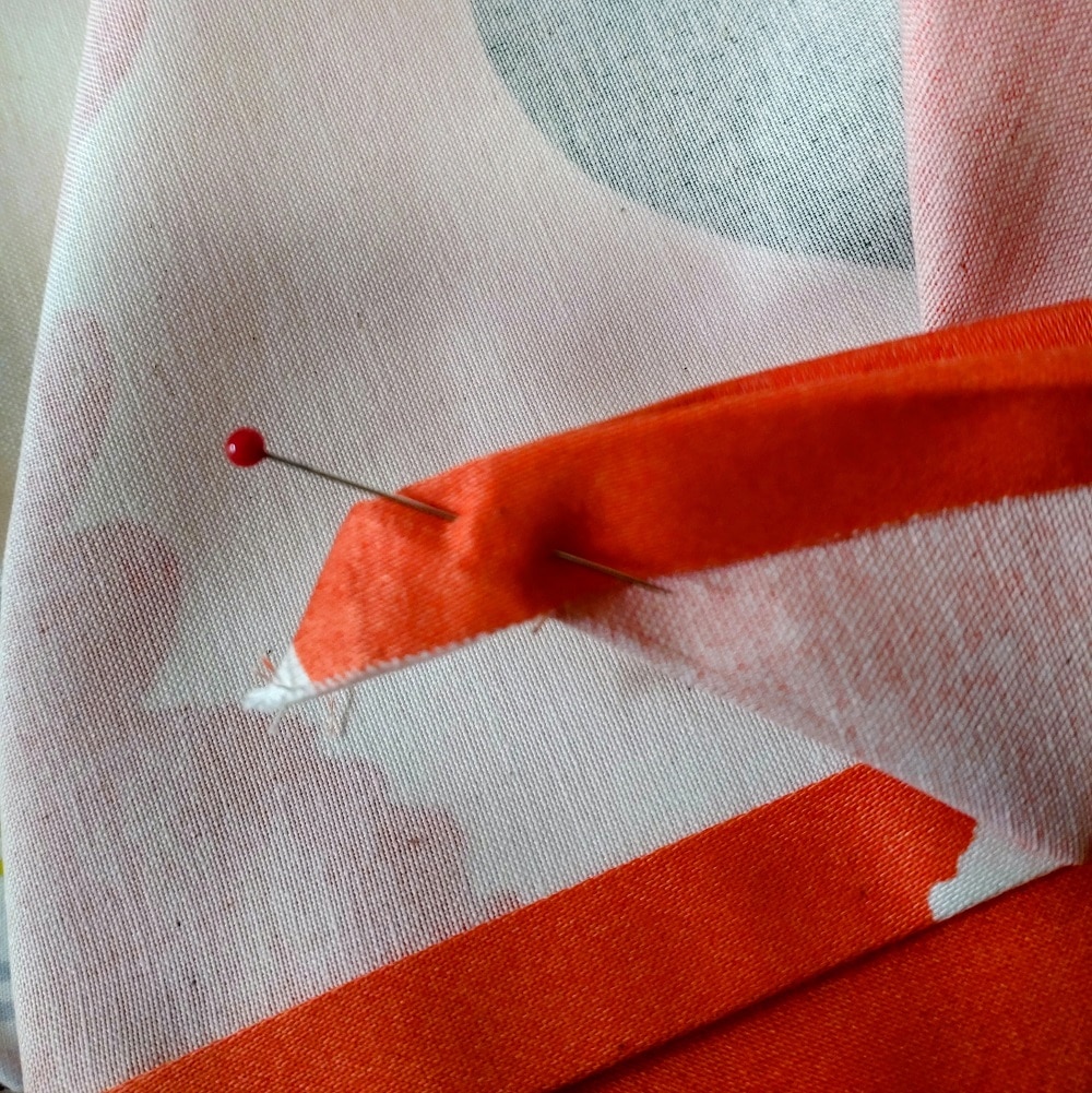額縁仕立ては三つ折りで端が重なり過ぎずにキレイに仕上がるので、四角のものを縫うのに適していると思います。今回のポイントはここです。