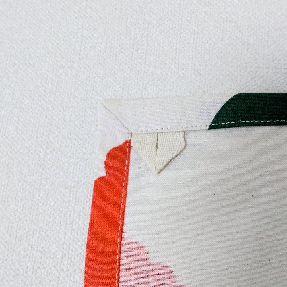 レシピは美濃羽まゆみさんの著書『暮らしの中の、手づくり布小物』から、キッチンクロスの作り方を参考にしました。『額縁仕立て』という方法で角を仕上げます。