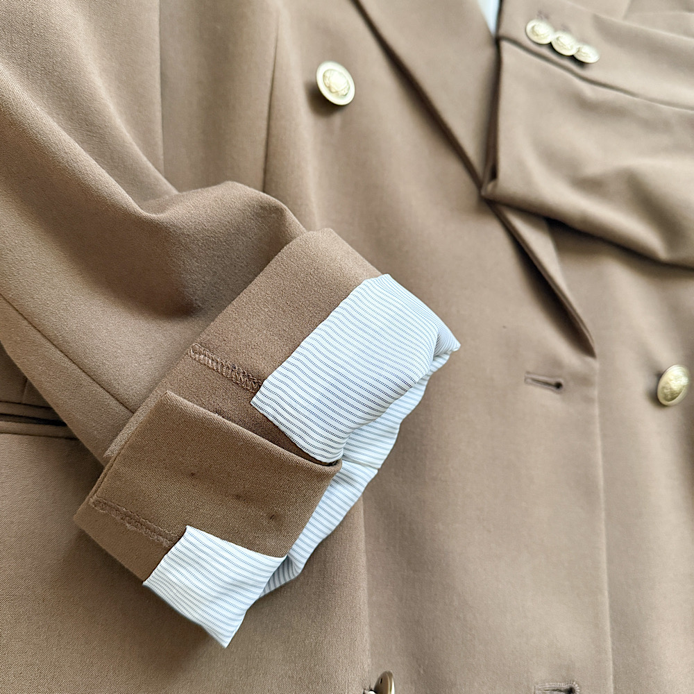 品のあるキャメルカラーが素敵で、かつ金釦。これは…と試着を。