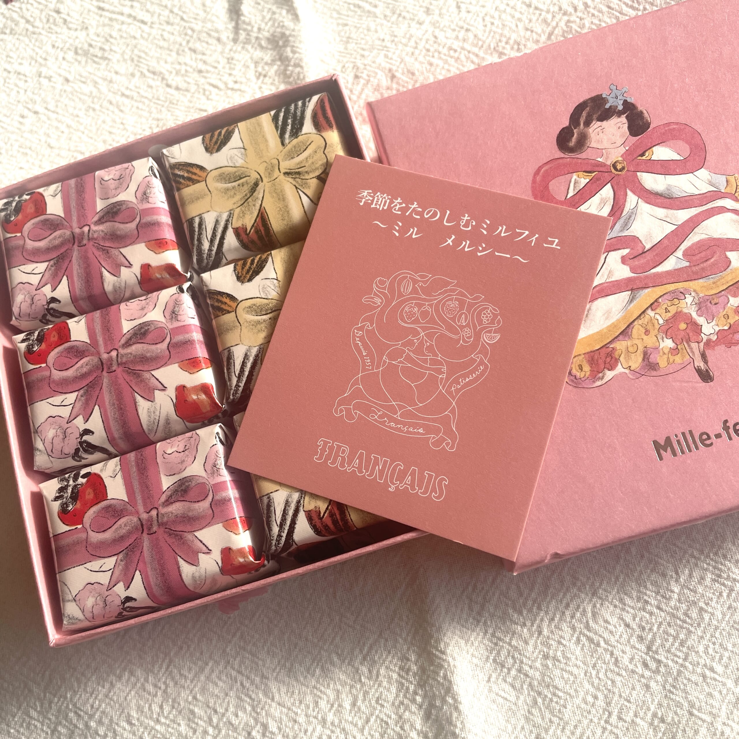 関東圏の百貨店やショッピングモールにある「フランセ」の期間限定ミルフィユ「ミルメルシー」。果物のイラストが特徴的ですよね。