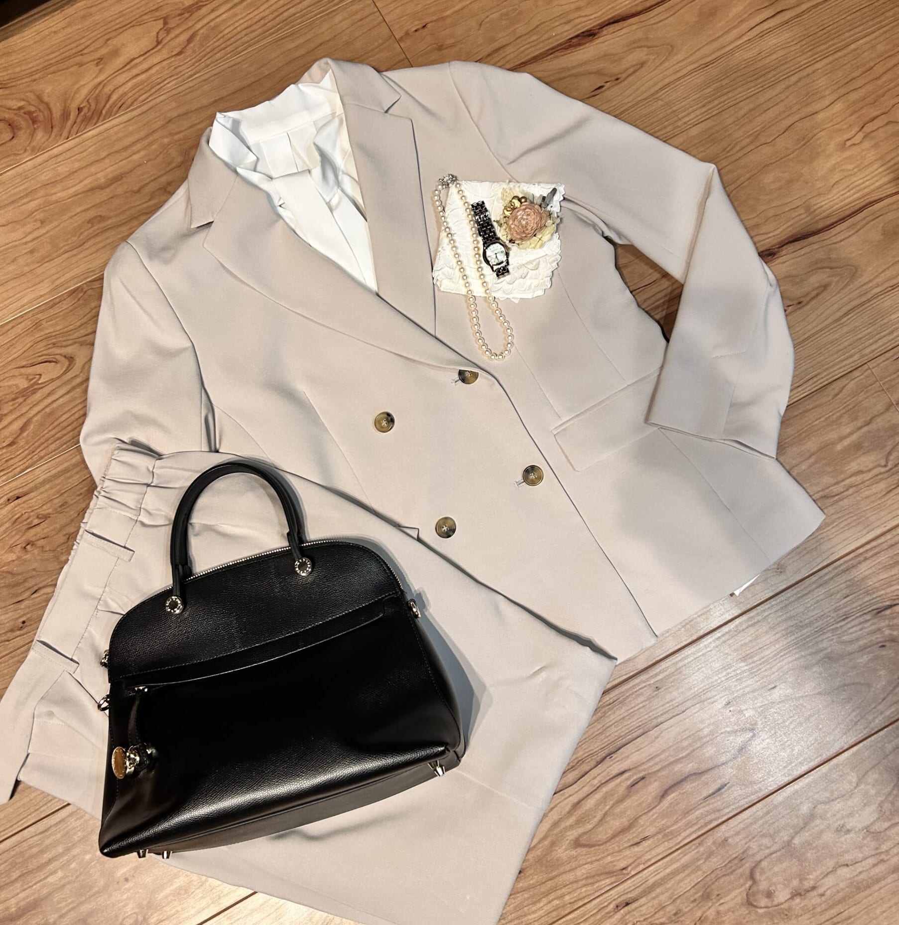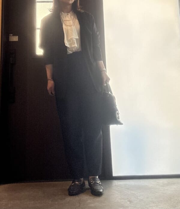ジャケットとパンツは黒+動きのある白ブラウスの予定です