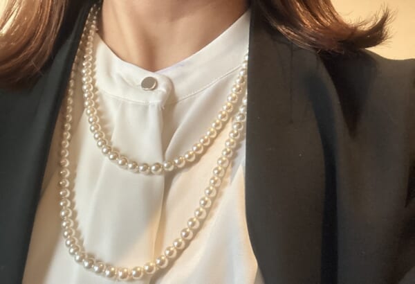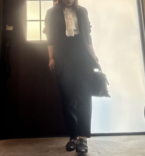 ハイウエストはおなか回りが気になりますが…パンツのウエストにギャザーがあることとジャケットの丈が長めなこと、そしてブラウスのフリルとパール二連で目線を上げておなかぽっこりも多少は隠せそうです。