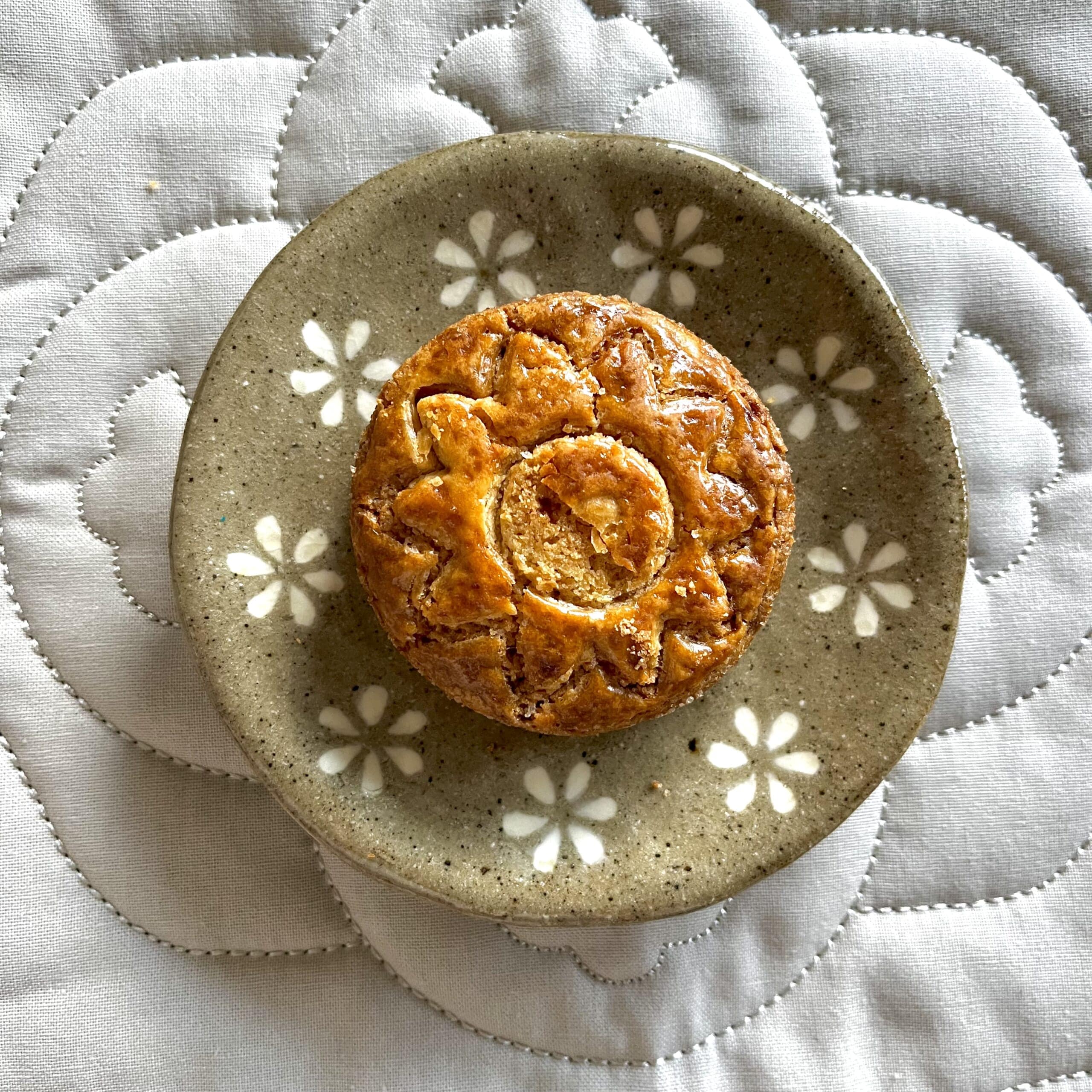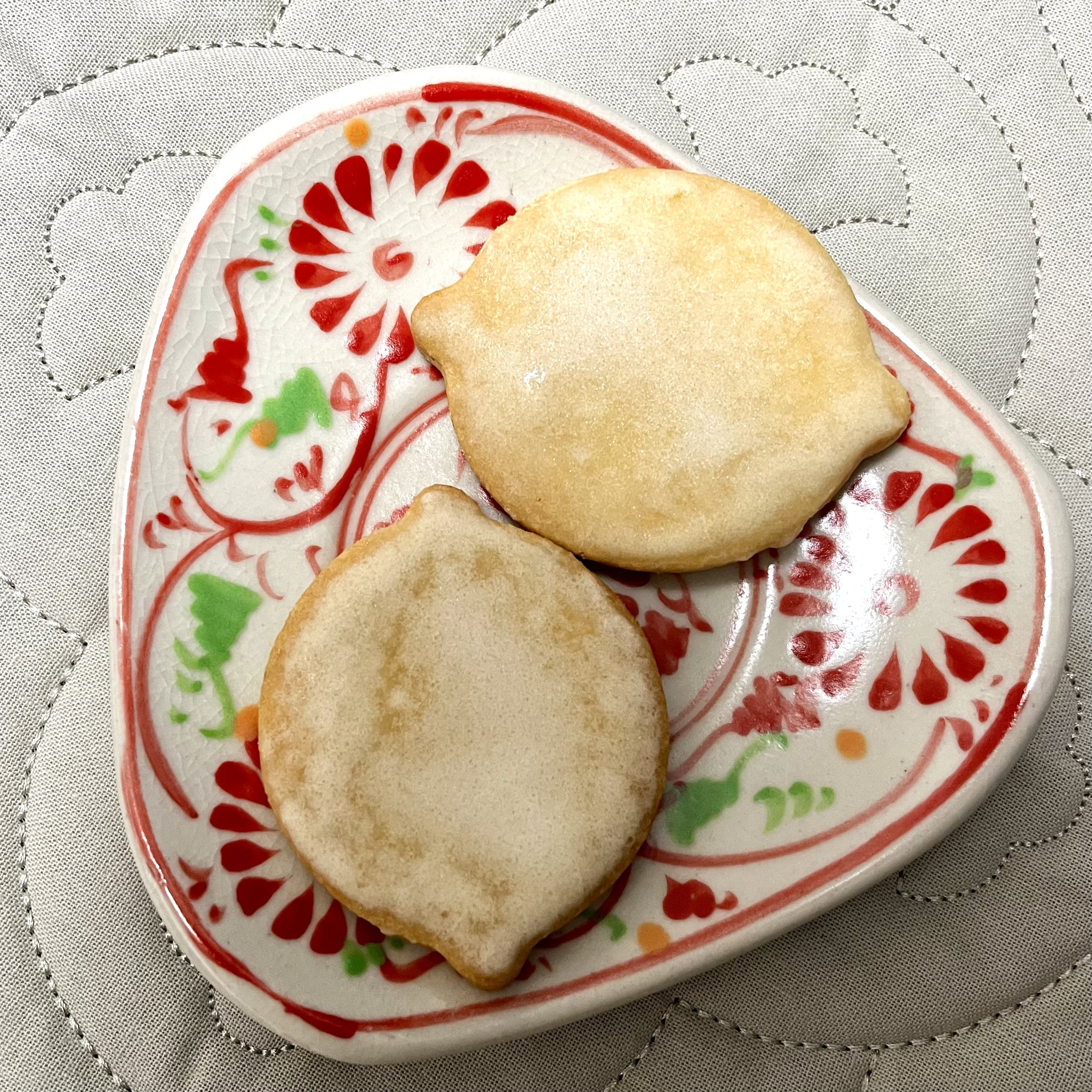 「カルディ」ではベトナムのバッチャン焼きのうつわと食べ物のセットが販売されるときがあります。これはデミタスカップとソーサーのセットで販売されていました。一目ぼれして購入しましたが、カップは小さすぎてほぼ使わず…。しかしソーサーの方は、このようにお菓子のお皿として活躍しています。