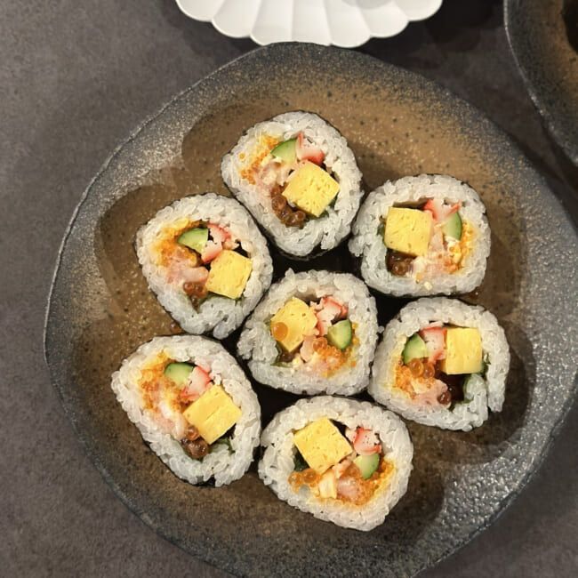 えび、いくら、まぐろのたたき、とびこ、たまご、大葉、海鮮サラダ、カニカマ、きゅうりと、盛りだくさんの内容。これだけの具材を揃えて巻くのは、私には到底不可能…!