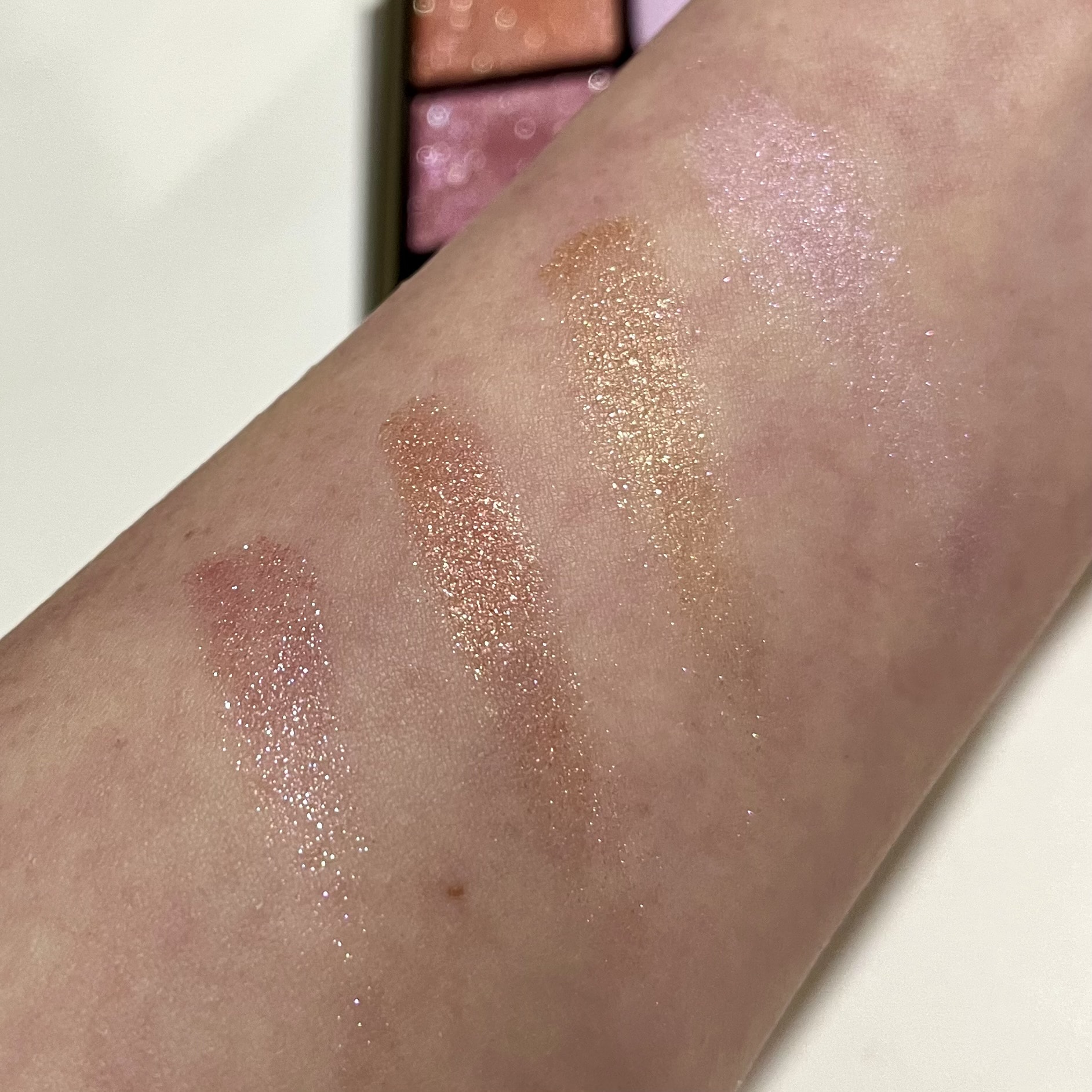 スック公式サイトの説明には「桜、梅、桃、すももの花が咲き誇る、百花繚乱の世界を閉じ込めたパレット」とありました。なるほど、春の花の色なのですね。青みピンクと黄みピンクの両方入っているのは使いやすそう!