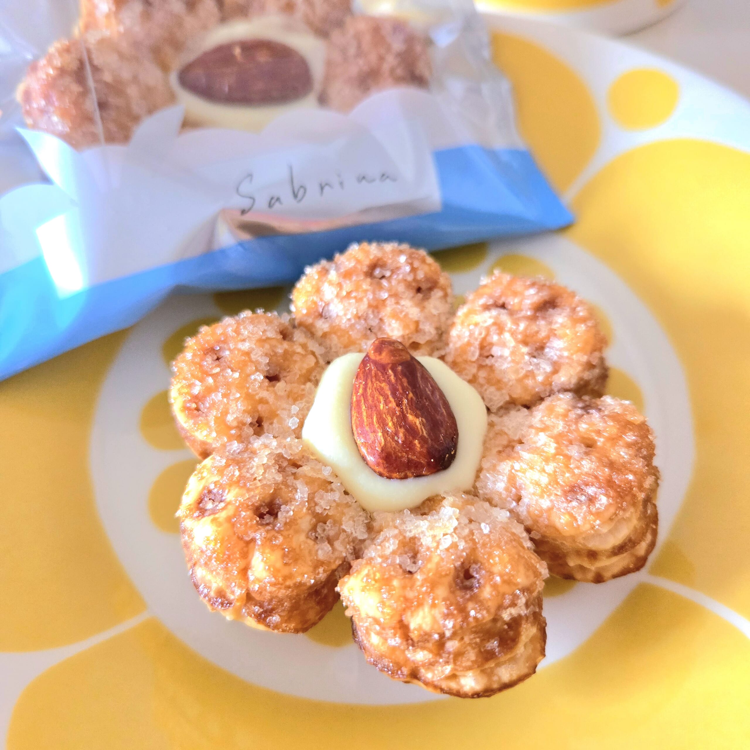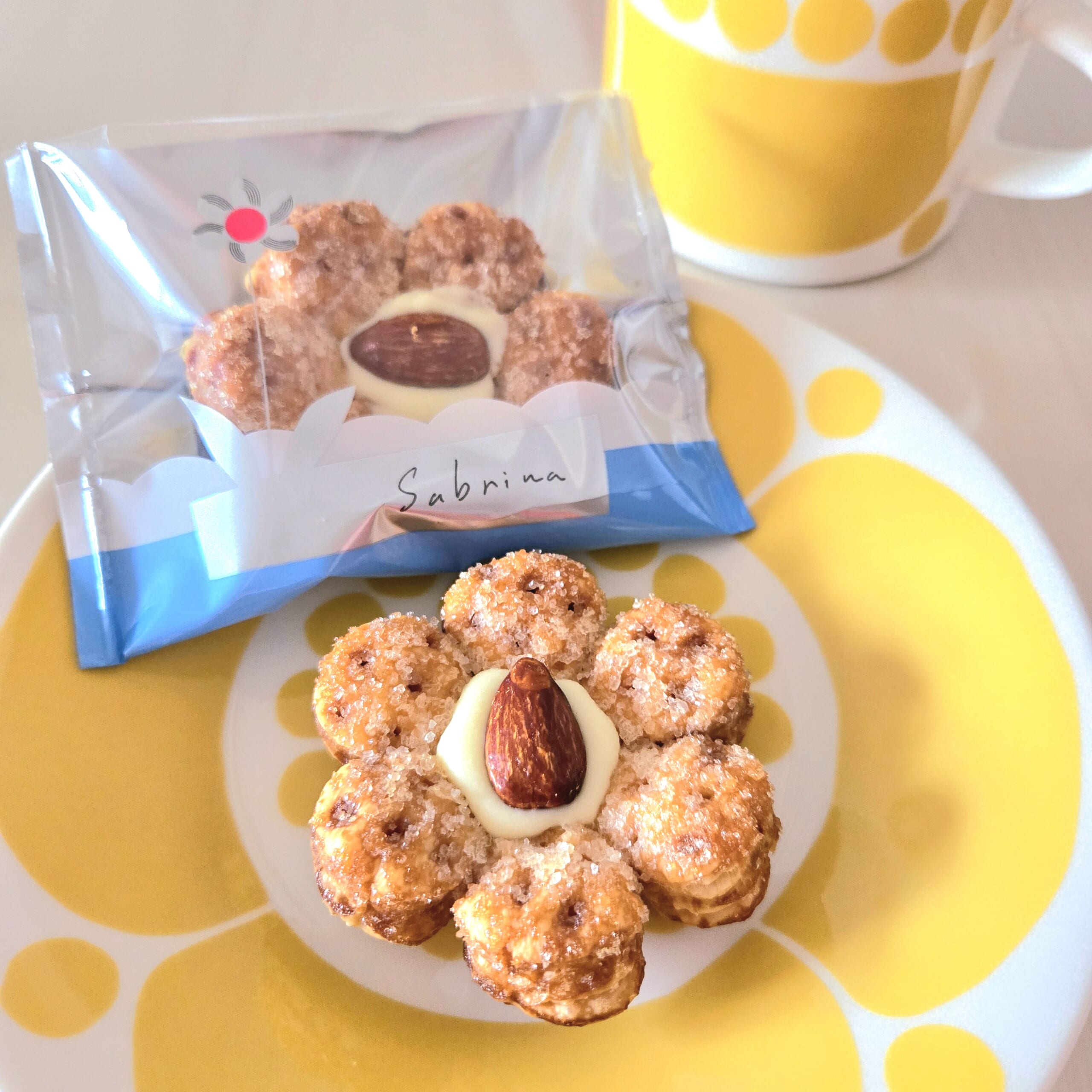 このサブリナ、本当に美味しくて私は大好きです🥰バターの甘味がしっかりしてるけど、さくっと軽やかなパイ生地なので、くどくない美味しさ✨花びら1枚ずつ味わって食べてしまいます🤭ちなみに真ん中のアーモンドの下はバタークリームですが、私はホワイトチョコに感じます!これもまた美味しいのです🥰同じバターでも色んな味わいが楽しめる、納得の人気焼き菓子です✨