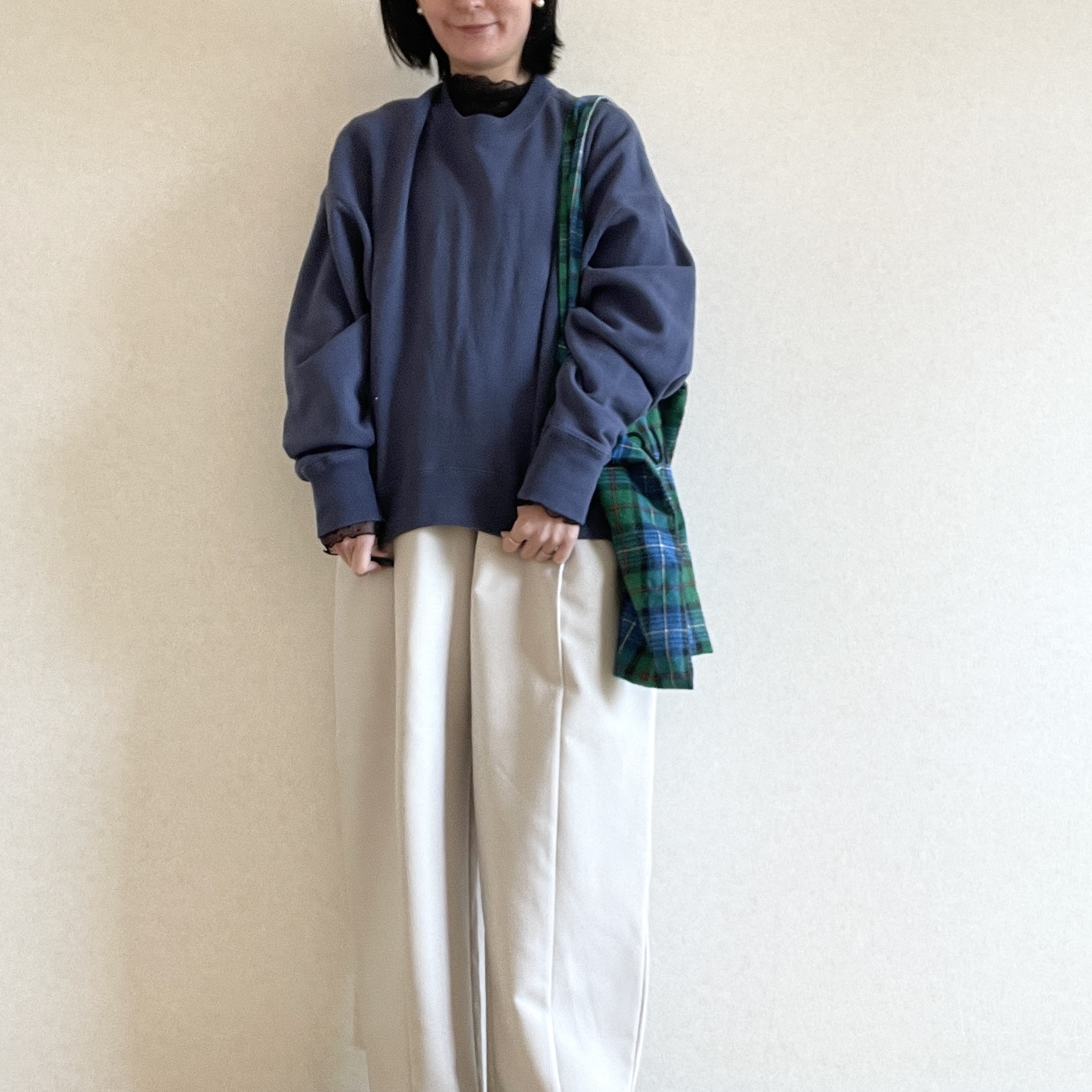 最近一番着ているトップスはこのスウェットです。ゆるっとしていて余裕があるので、インナーに薄いタートルやシャツを合わせたり。バッグは上と同じトートバッグです。