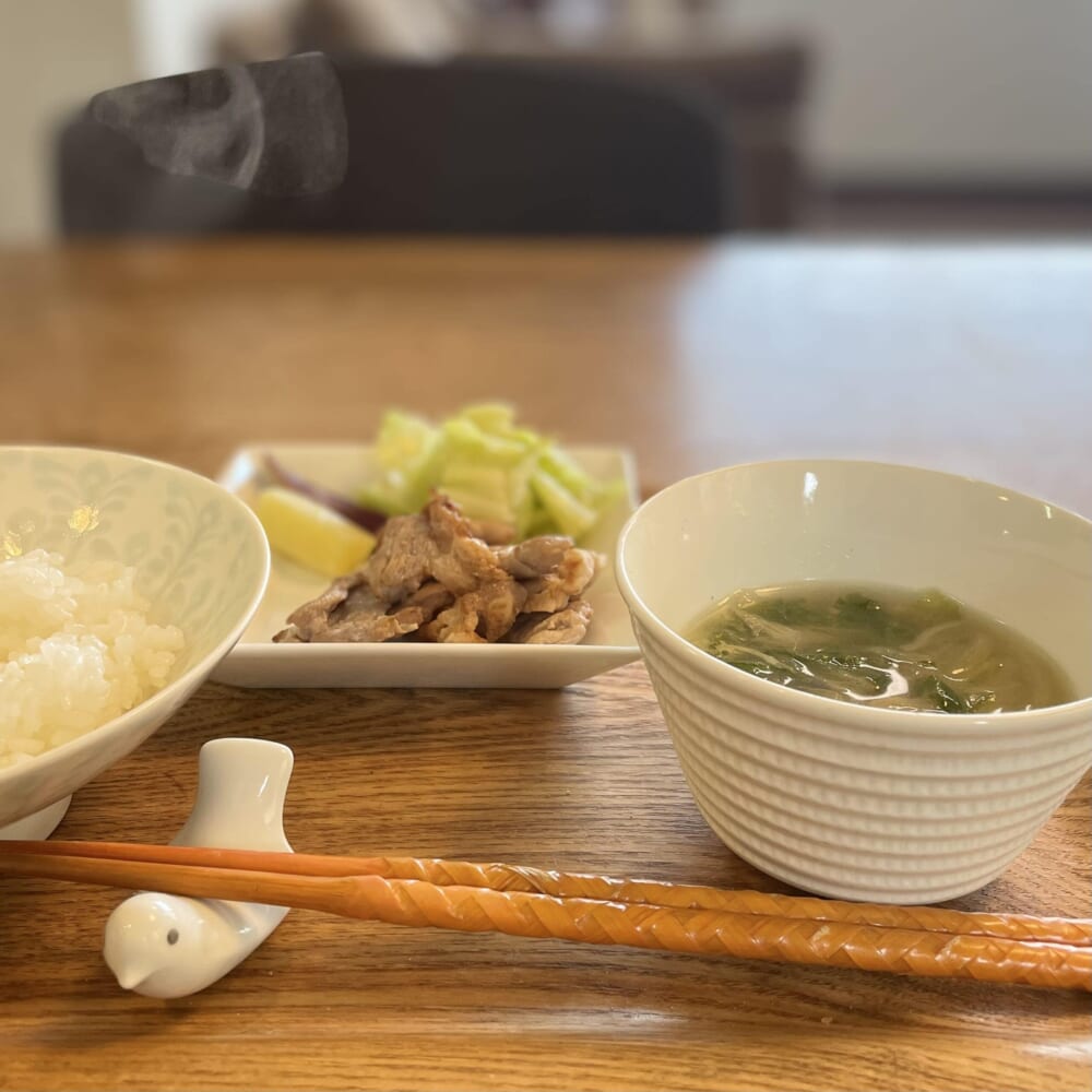(お茶碗は白山陶器の平飯茶碗。お箸は故郷、福岡県久留米市の伝統工芸品「藍胎漆器」で、別途クリップを書きたいなと思っています。)