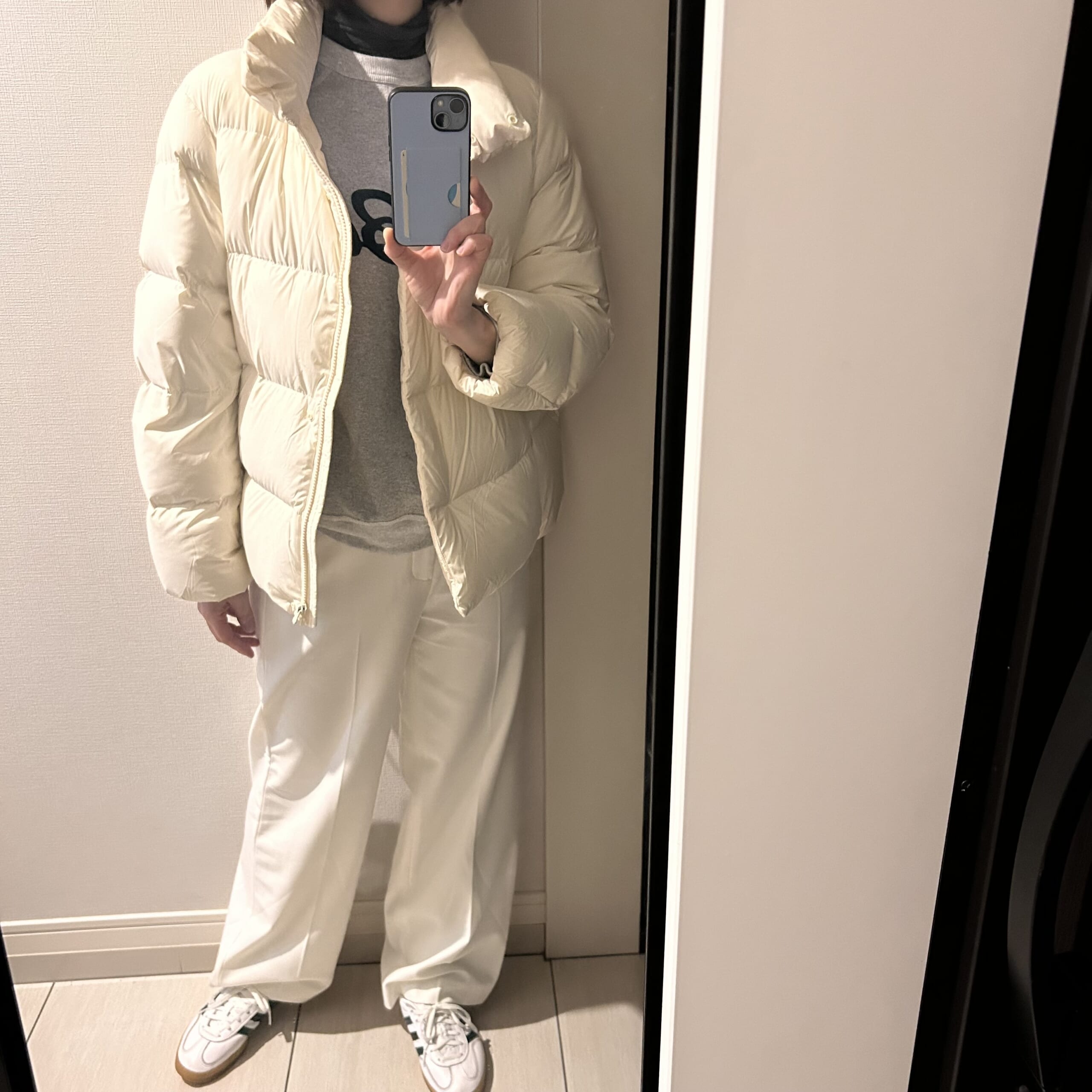 理由は、コンパクトさがドンピシャだったから。中に着込んでも大丈夫そうだし、色はグレーのロゴの方が私の今の好みでした。やっぱり試着大事だわー、と自分を納得させ、さっそく次の週おろしました。