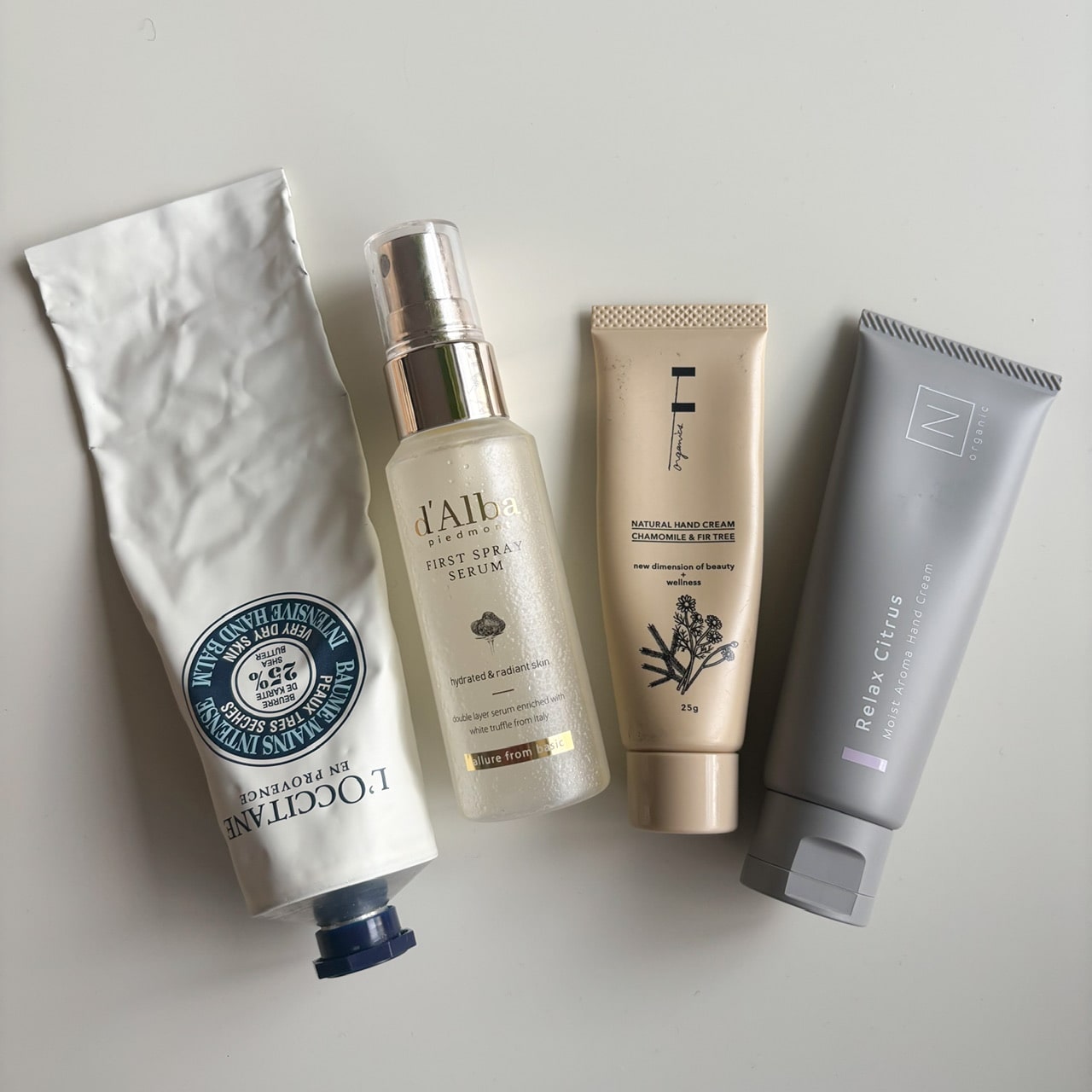 かさつく時にシュッと一吹き、かなり乾燥しているときや就寝前は化粧水後にハンドクリームを塗りました。