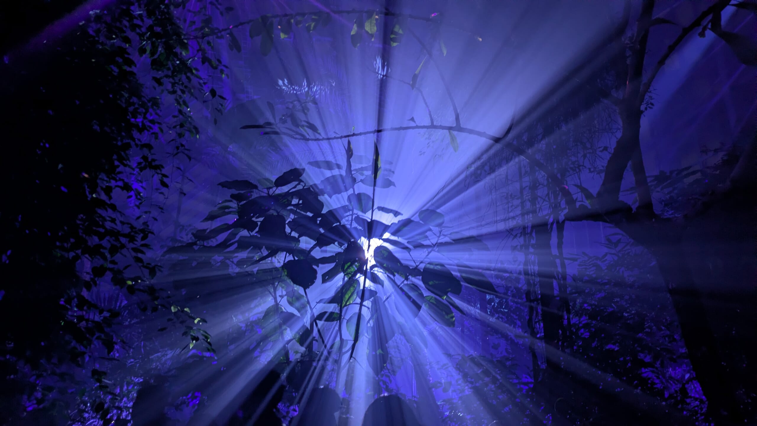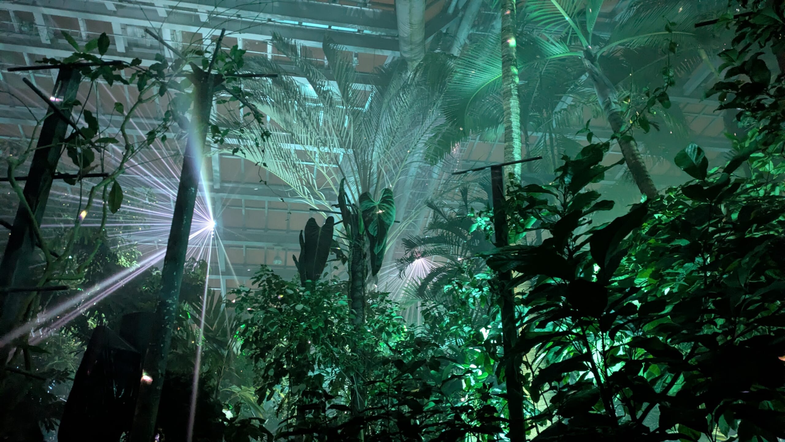 張り巡らされたレーザー光線と、霧の中に浮かび上がる熱帯植物たちのシルエットの演出は圧巻!不思議うな没入感に包まれました。