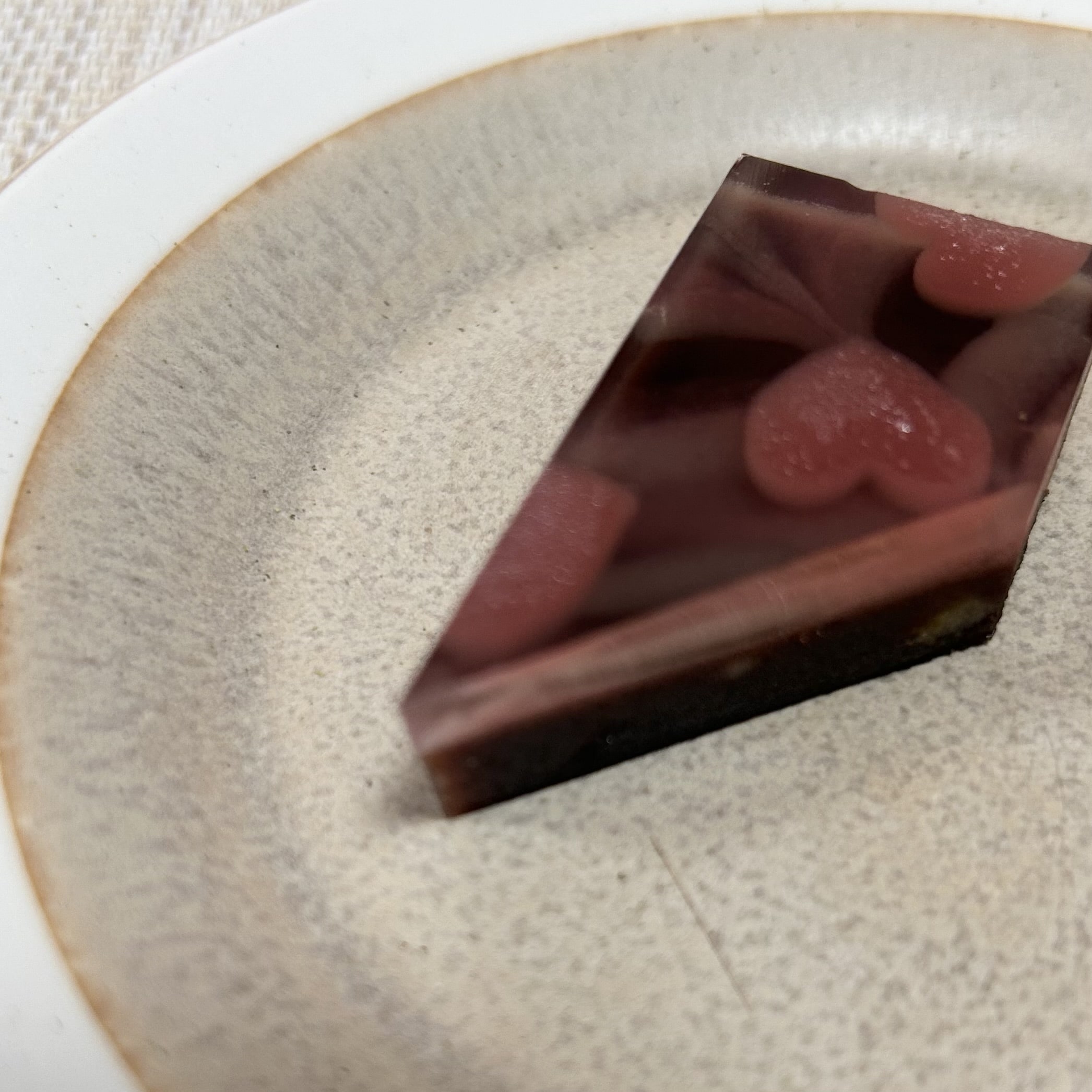 可愛い♡食べるのが勿体無いくらい可愛い。公式サイトによると、チョコとホワイトチョコのマーブル模様をほどこしたオレンジピール入り「チョコレート味の羊羹」に、「錦玉羹」を重ねたものだそう。