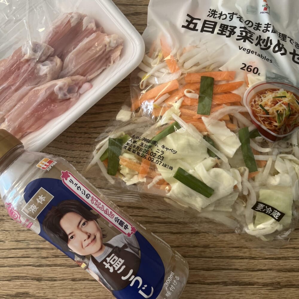 骨付きの鶏肉と、適当なカット野菜と、塩こうじを用意します。