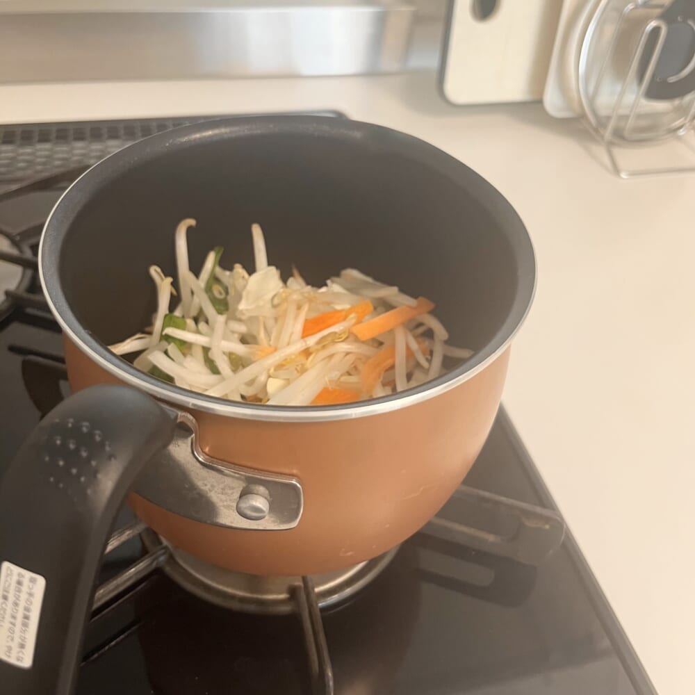 袋半分ぐらいのカット野菜、水100㏄ぐらいを適当に入れて…
