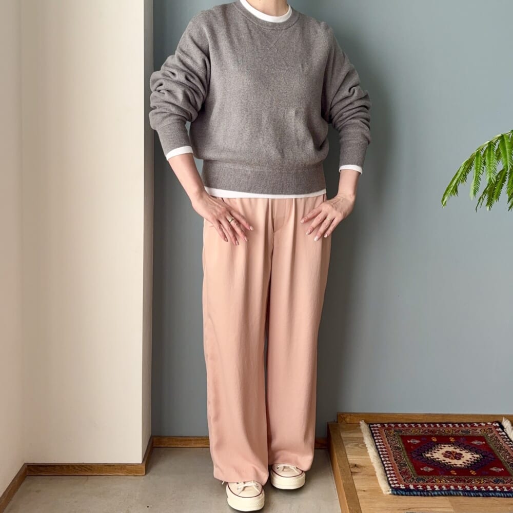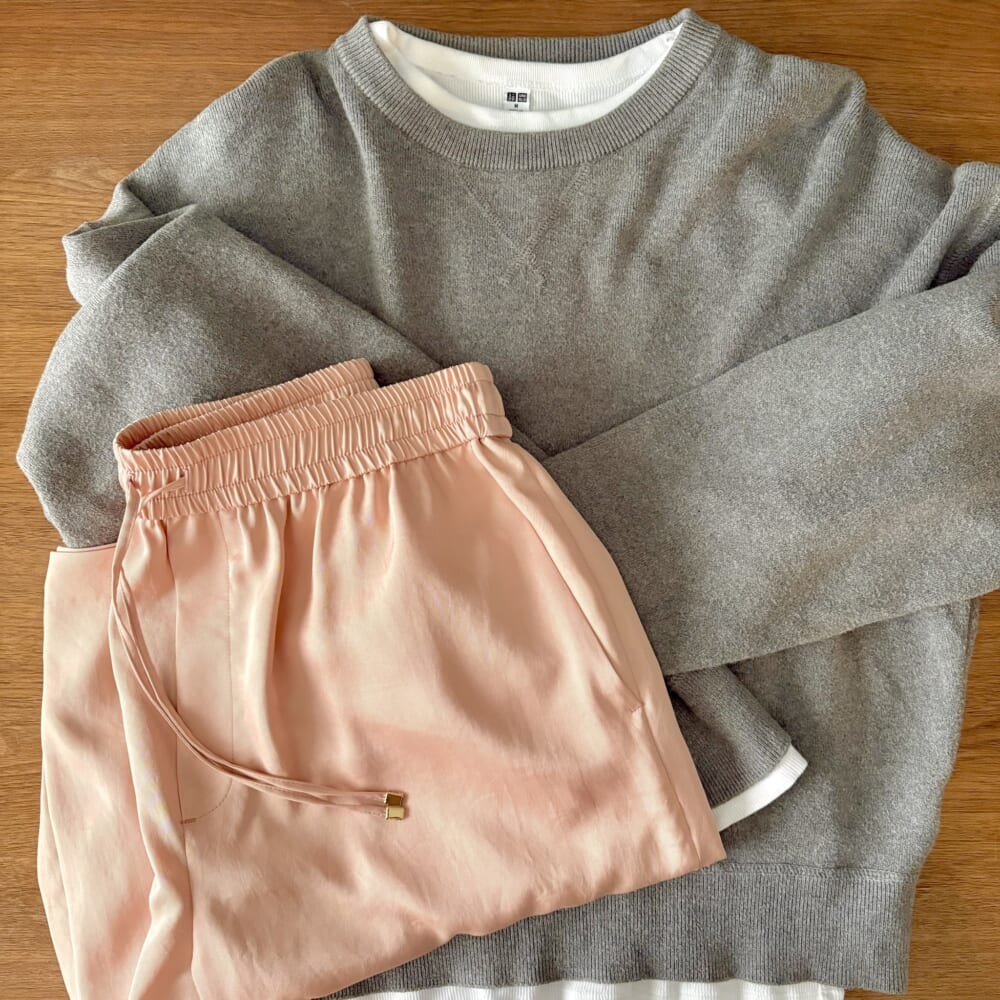 グレー&ピンクの組み合わせが好き。そして、スウェット&キレイめパンツの組み合わせも大好きです。