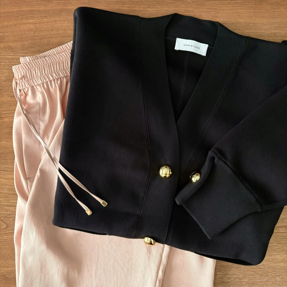 ゴールドの大きめボタンがアクセントの、スウェットライクな厚手カーディガンとも相性良き。