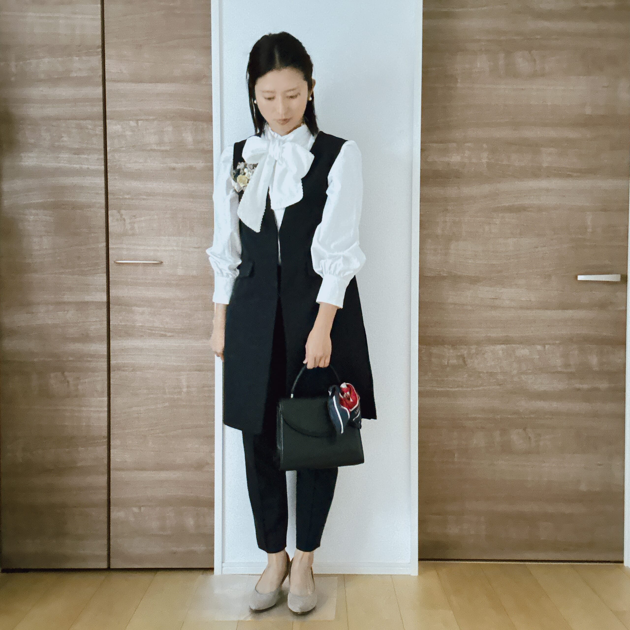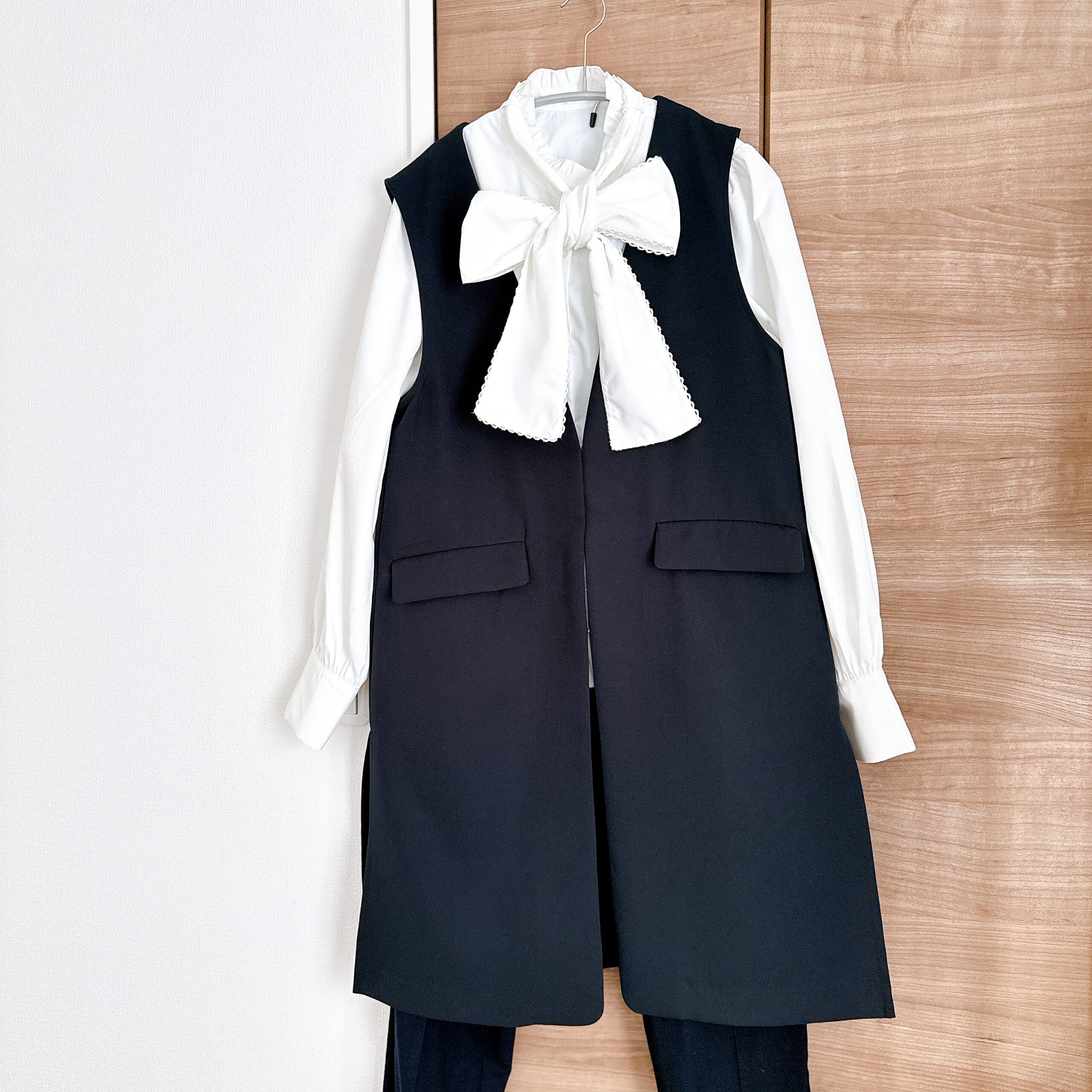 前回のブログでご紹介した、しまむらのジレとHoneysのリボンブラウス、手持ちのジレを使って、コーデを考えてみました。