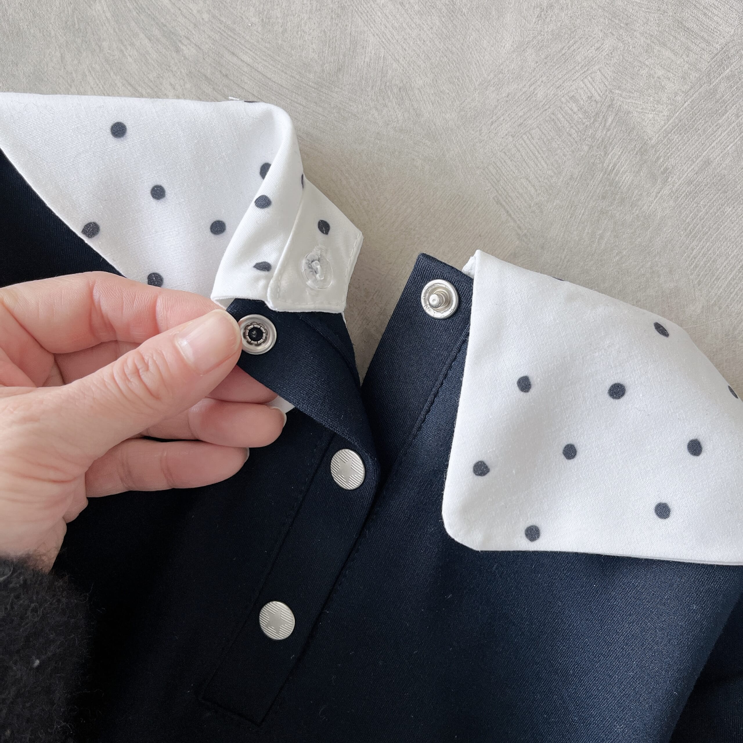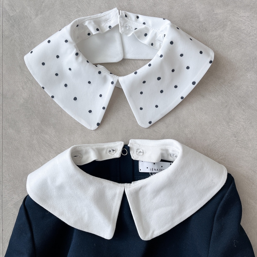 白の襟、ドットの襟、襟を外せばシンプルなワンピースとして普段使いしやすいデザインで、3wayで楽しめるところも魅力。