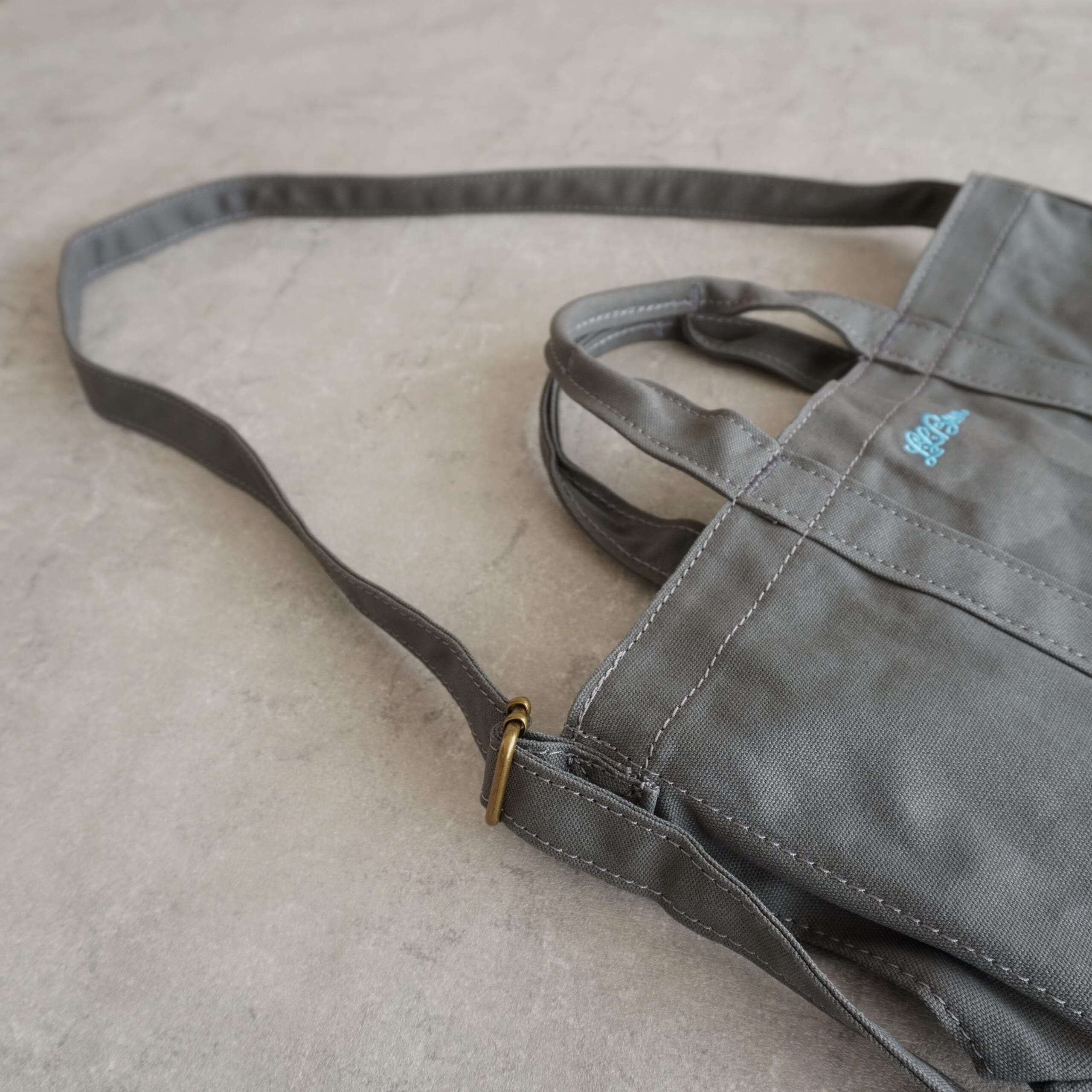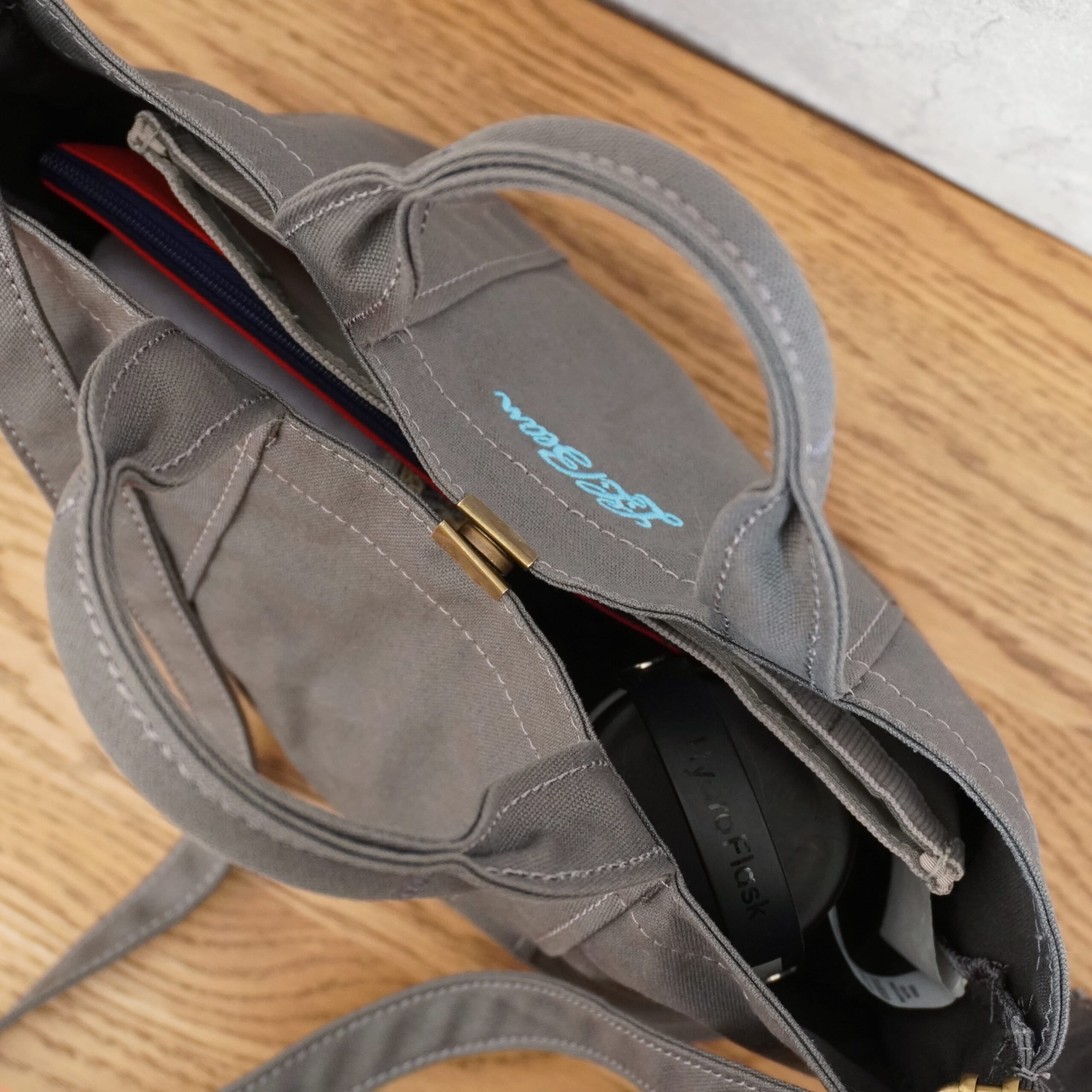荷物が多い日や旅行へ…そんな時はグローサリー・トートのハンドル部分に引っ掛けて2個持ちしてほしい!そんな想いから、スモールトートの持ち手の長さを細かく計測して製作しているのです〜