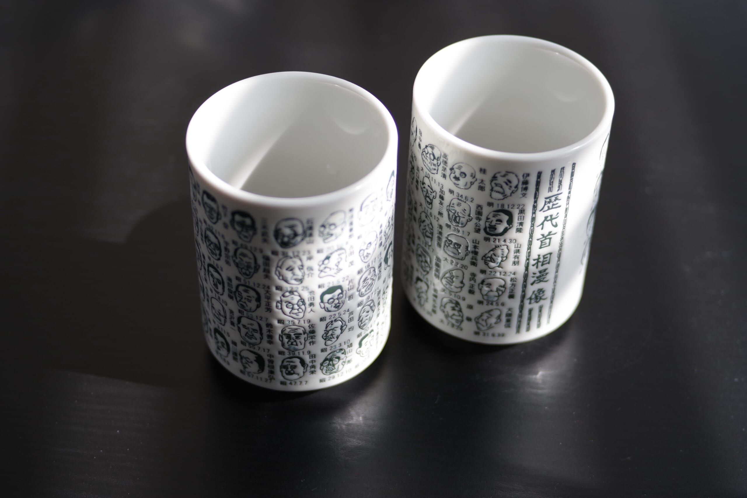歴代の総理大臣の顔がイラストになっている湯呑み。