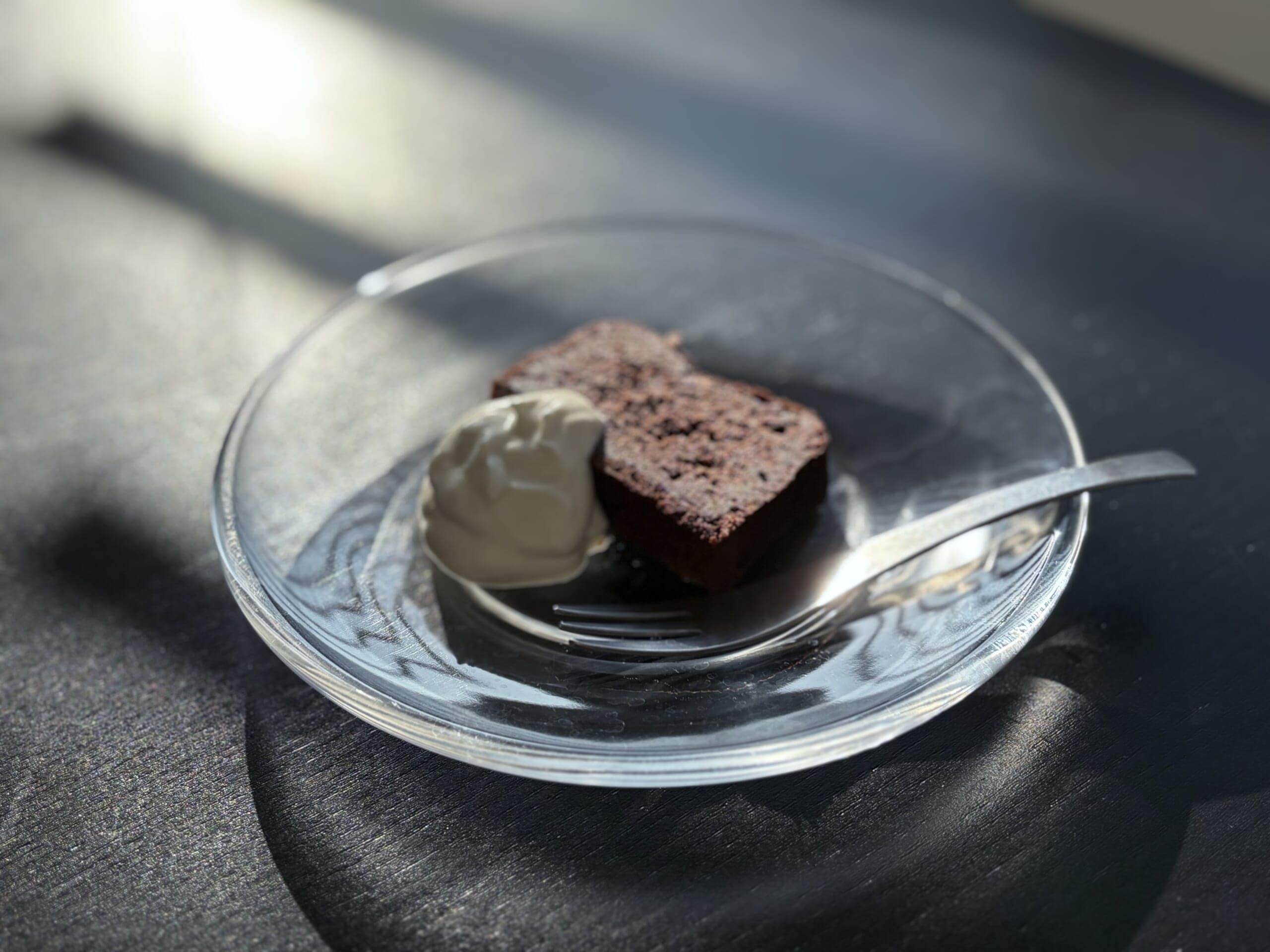 我が家も手作りの米粉でつくるガトーショコラを作っていました。濃厚ずっしりとしたケーキもガラス食器で軽やかに ……♡