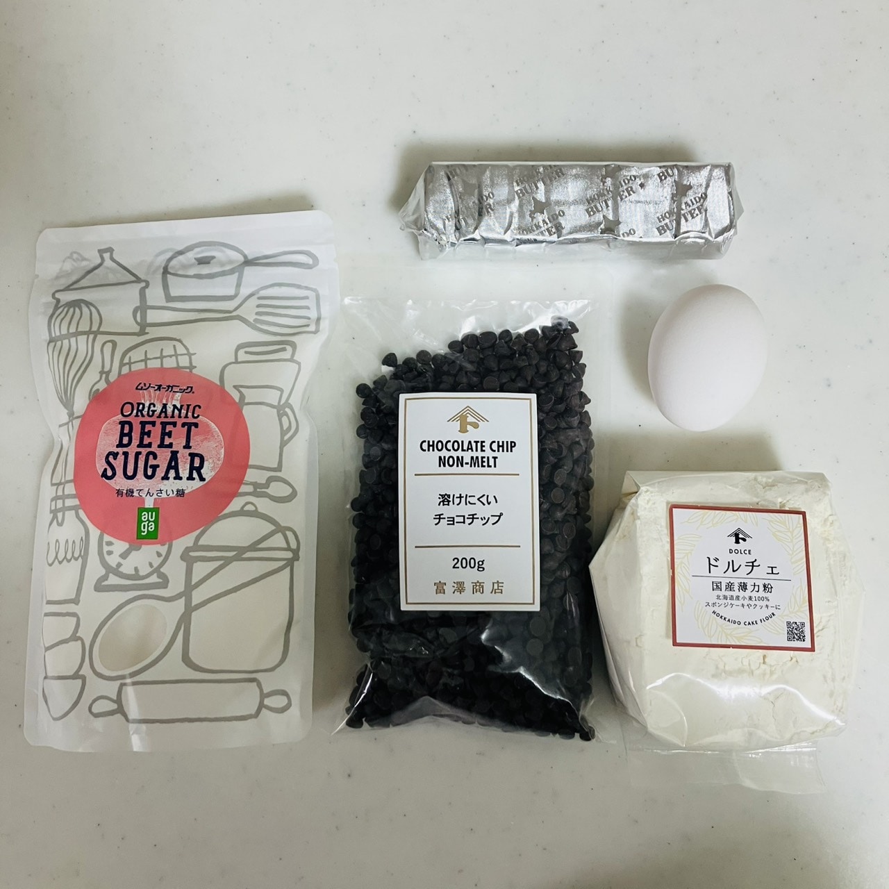 薄力粉180〜200g、砂糖75g、バター(無塩でも有塩でも)100g、卵1個、チョコチップ(板チョコを刻んでも)100g