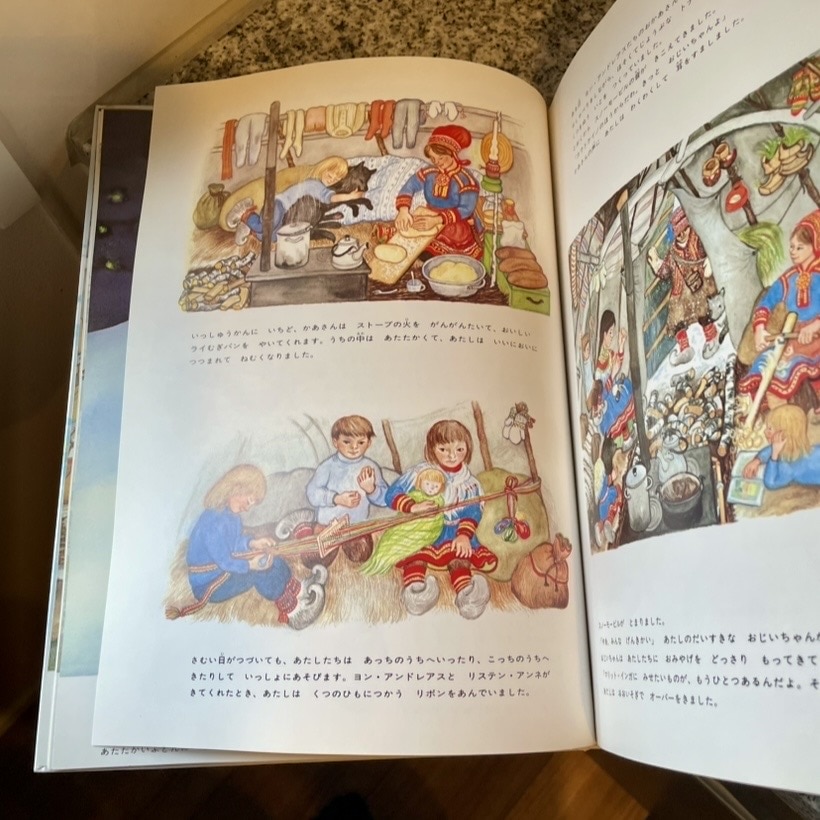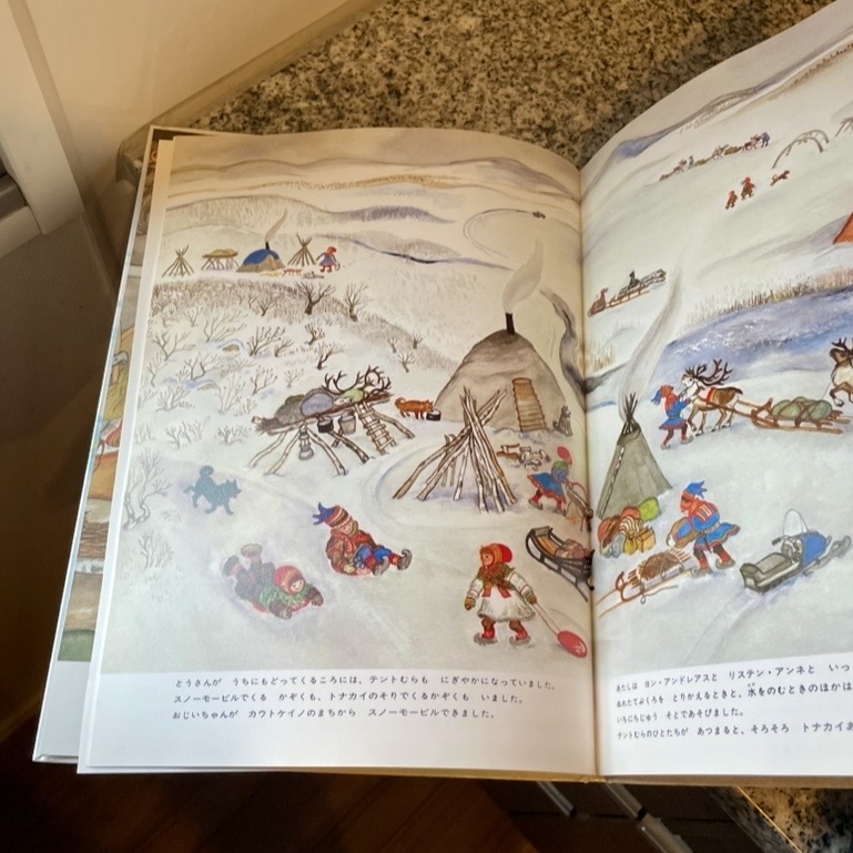 ラップランドと呼ばれる北欧のスカンジナビア半島の北部の地域で暮らすサーミ人と呼ばれる人たちのお話です。サーミ人は、トナカイを飼って生計を立てて暮らす人々のこと。トナカイの移動に合わせて自分たちも移動しながら暮らし、身につける服やブーツなどもトナカイの毛皮などを使い自分たちえ作ります。そんな遠い北の地で生きるサーミ族の5歳の女の子が主人公の絵本です。