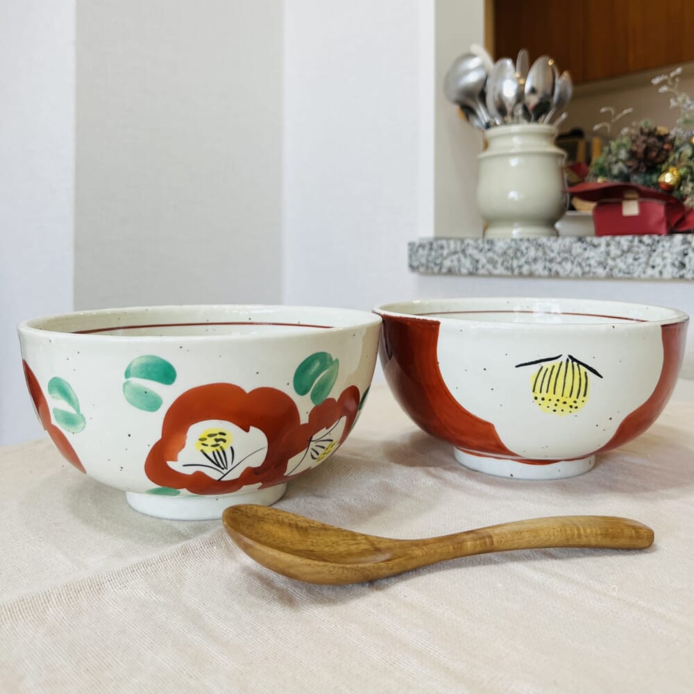 真っ赤な器に大きな椿が描かれた「赤絵 椿」の丼と、白地に赤と緑で椿が描かれた「色絵 椿」の丼です。小ぶりでころんとしたフォルムがちょうどいいサイズで、見た目よりずっと軽いのが特徴!