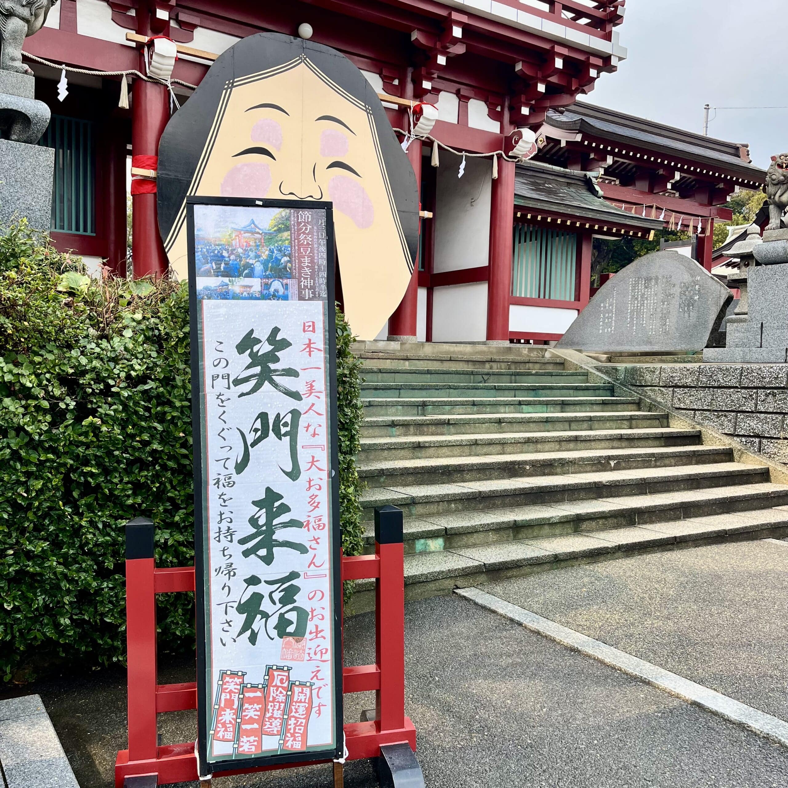 Day2で訪れた、北九州市小倉北区にある「篠崎八幡神社」。こちら節分シーズンだったからか、入口に大きなお福さんが。よく見ると…「日本一美人な大お多福さん」。