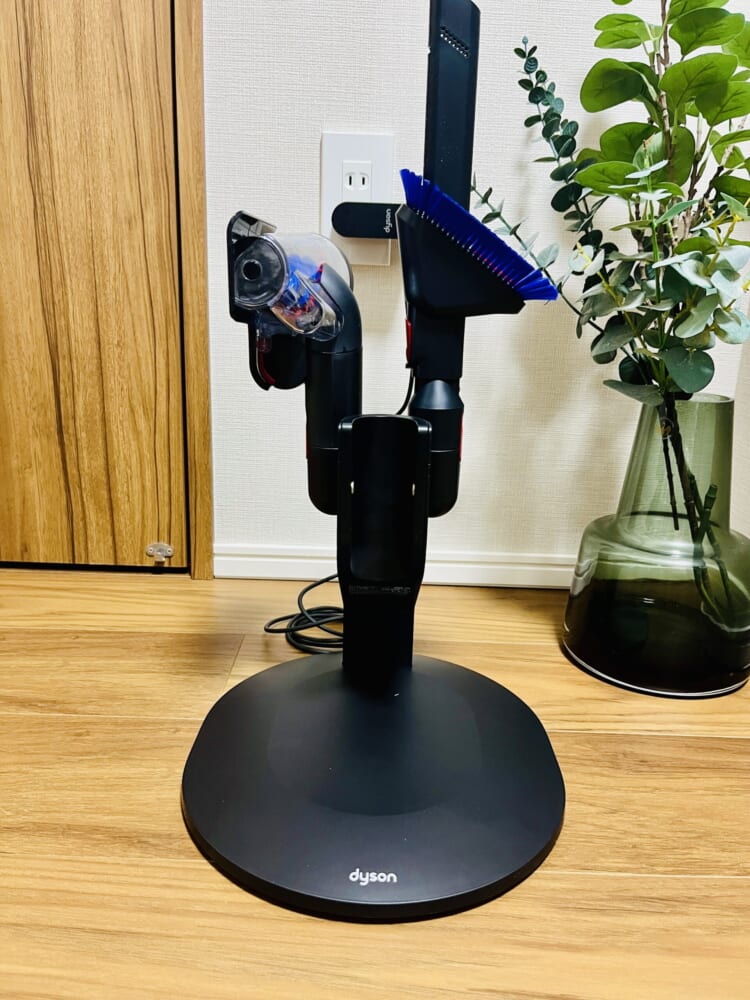 省スペース設計の充電スタンドは、お部屋の隅に置いてもすっきりとした印象。わざわざ片づける手間がなく、掃除機のために収納スペースを確保しなくていいという気軽さが魅力です。