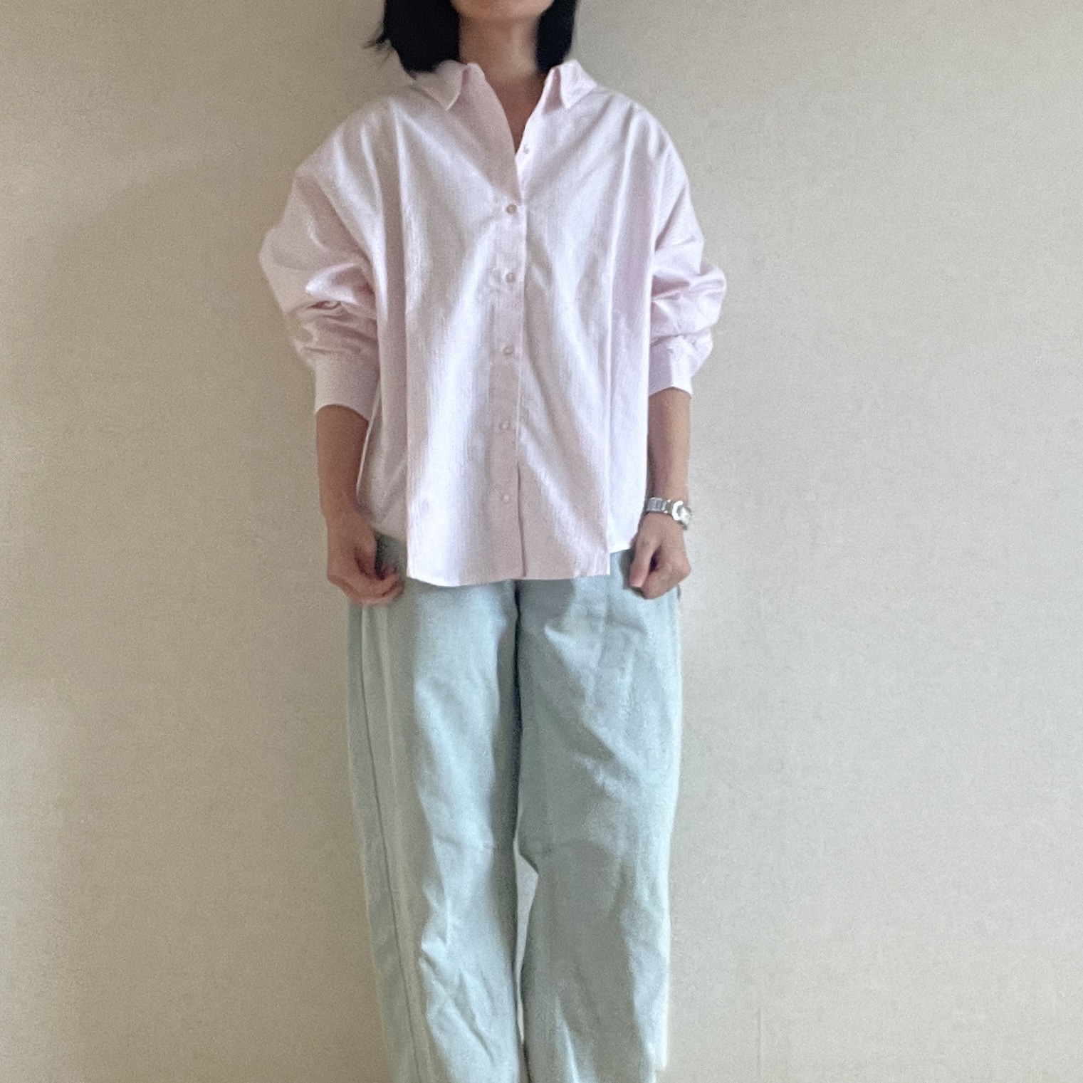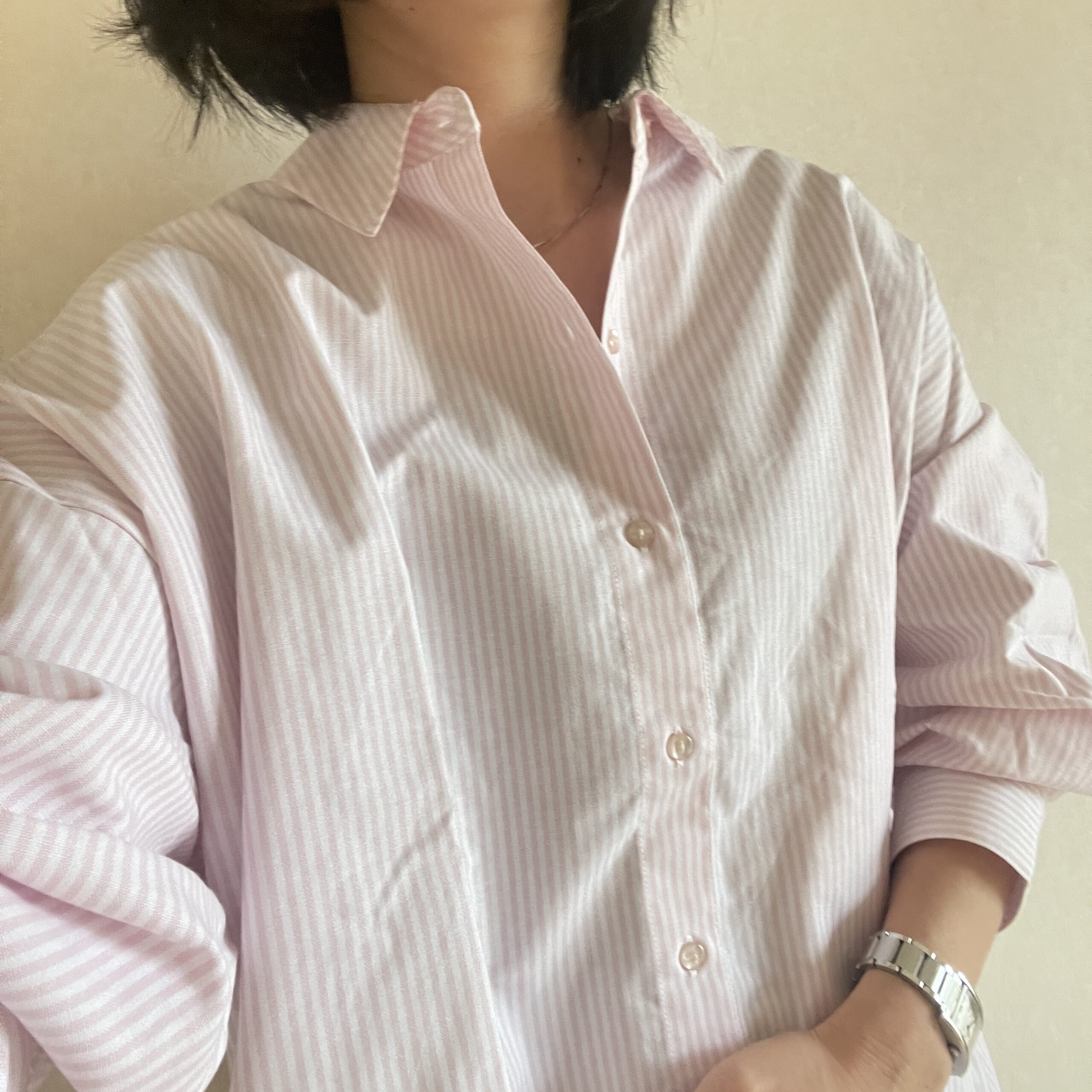 春らしいピンクのシャツ。薄いピンクのなので、大人も抵抗なく着られます。