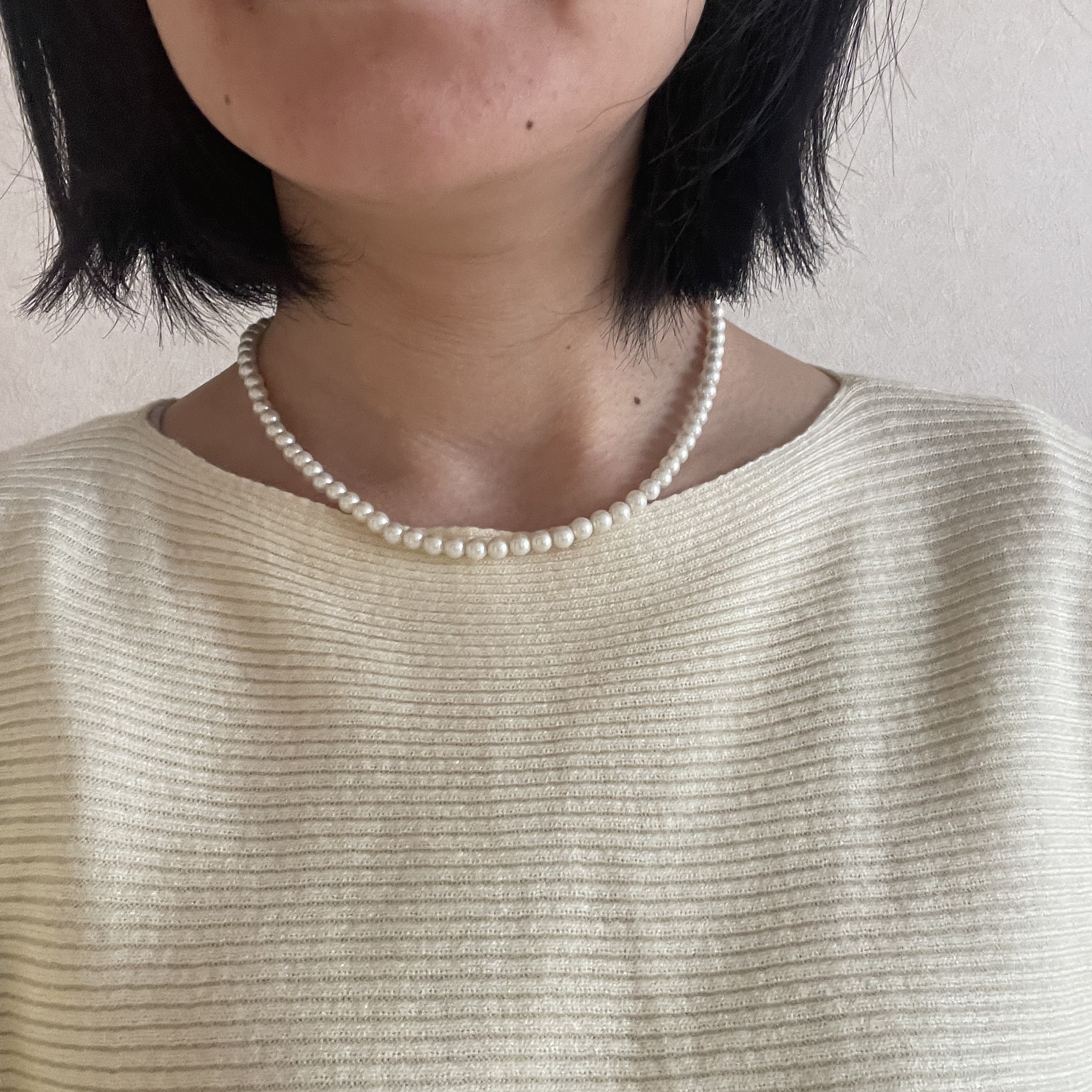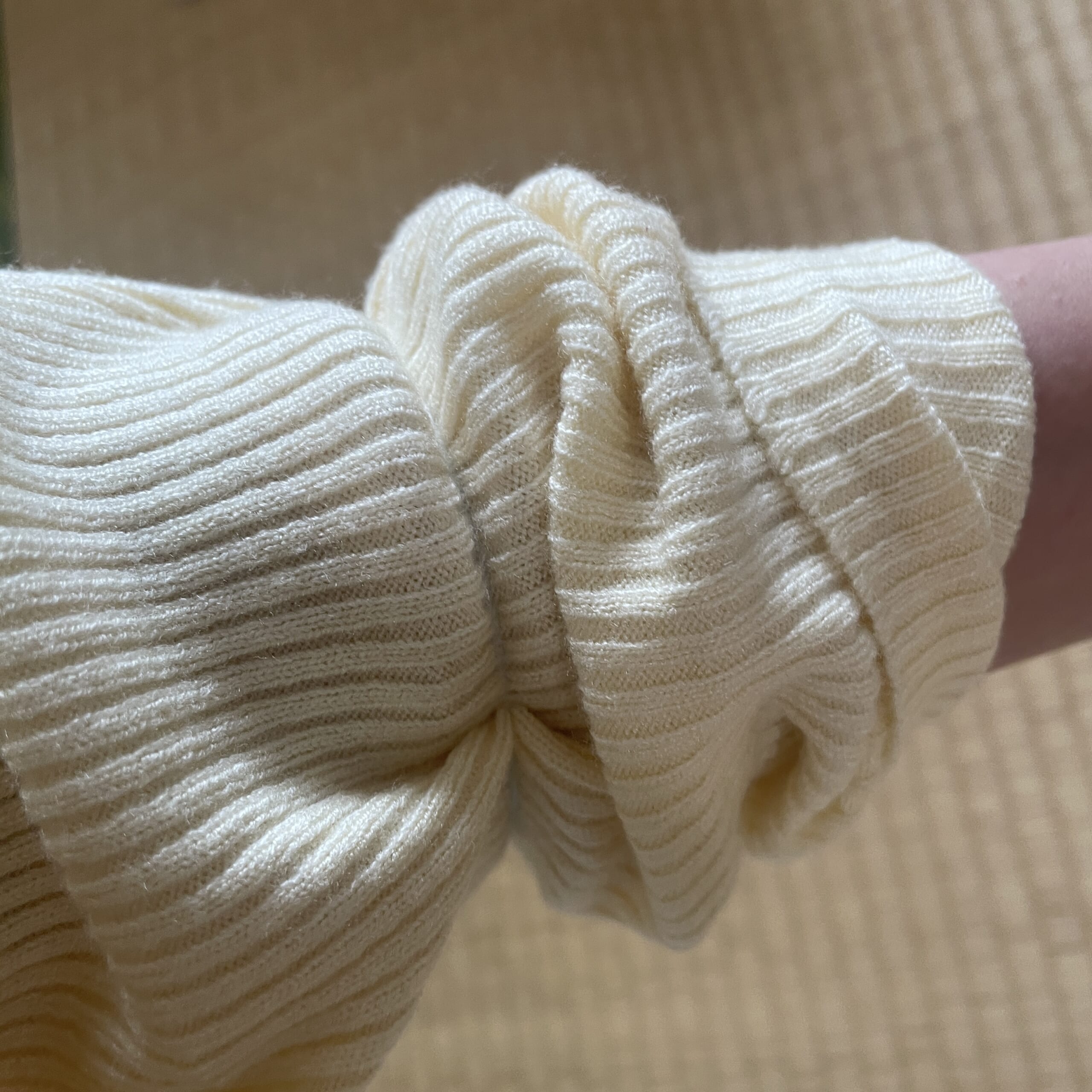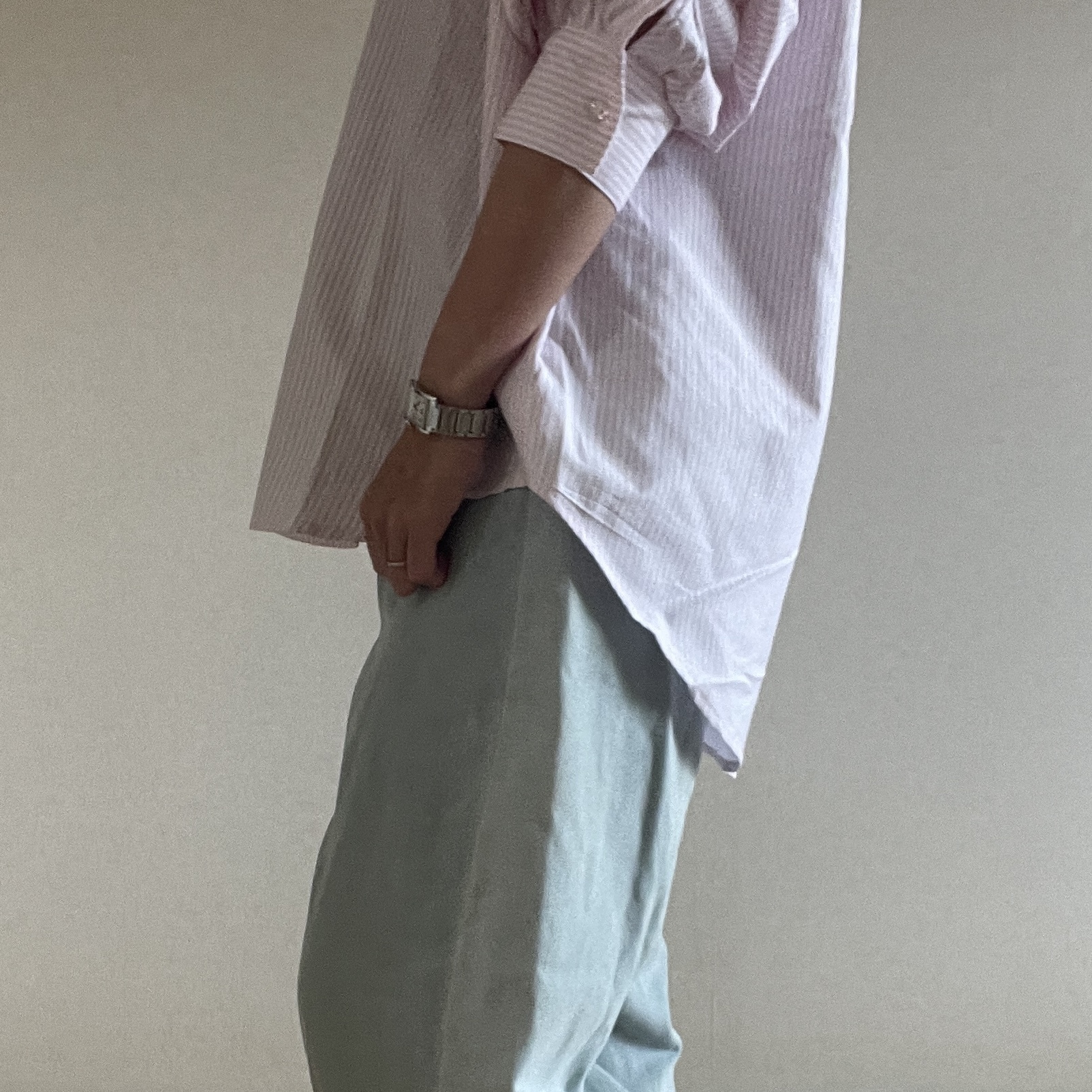 腕まくりスタイルが好きなのですが、こちらのニットはすぐ落ちてきてしまうので、透明のゴムで止めて着ようと思います。