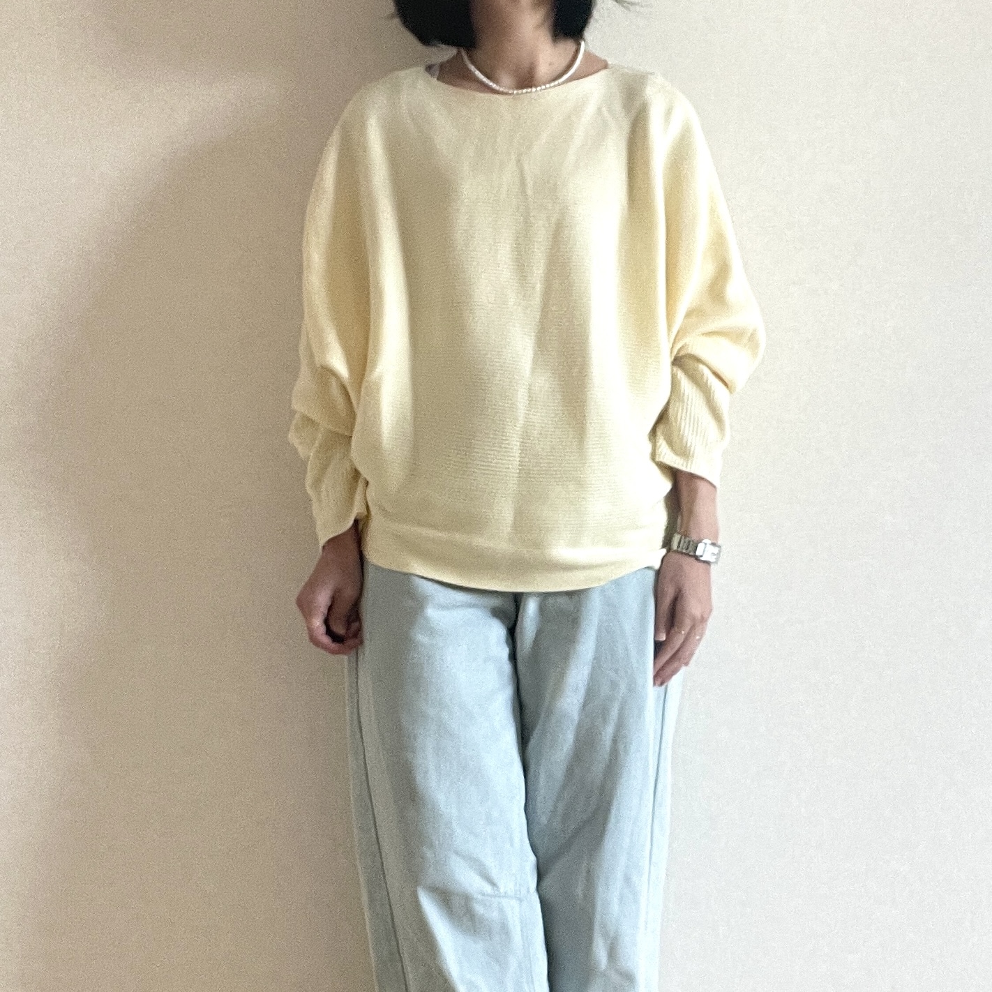 ニットで気になるのが、二の腕のラインなのですが、ドルマンスリーブなので華奢見えします。