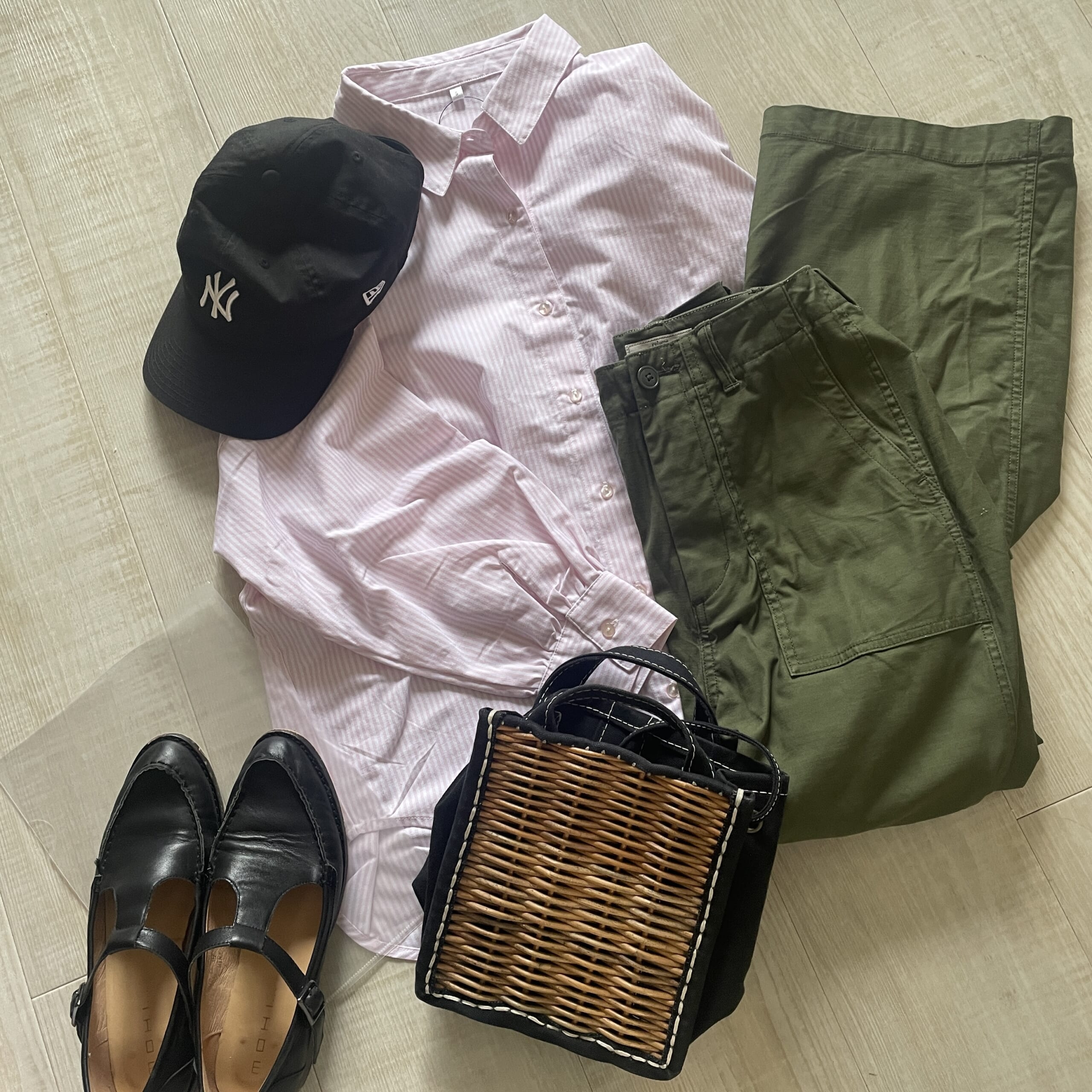 【コーデ】ピンクシャツはカーキと黒で引き締める
