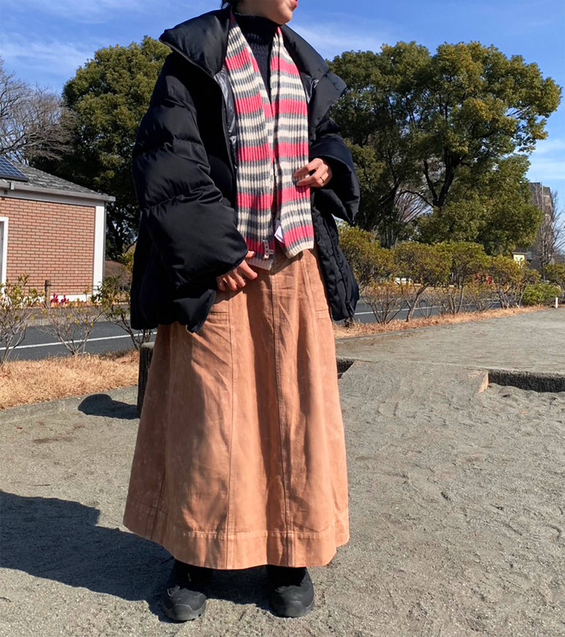 大変重宝したのが実は妊娠中と赤ちゃん期。丈が長めで裾が広がりのパターンのおかげで大きいお腹もしっかり収まり特別にアウターを用意せずとも寒い冬を乗り切れてしまった。産後も前抱っこにしてお腹のところまでファスナーを閉めて着ていたり。暖かいし、撥水加工が施されてるしで申し分のない機能に加えてなんとありがたかったことか。いまでもマフラーいらずの首元まであたたかいデザインは寒い日の公園の味方だし、袖口の内側にあるリブは自転車に乗っても冷気が入ってこず、かなり助けられている。ゆえにこれを超えるダウンに出会えていない。来年もよろしくお願いします。