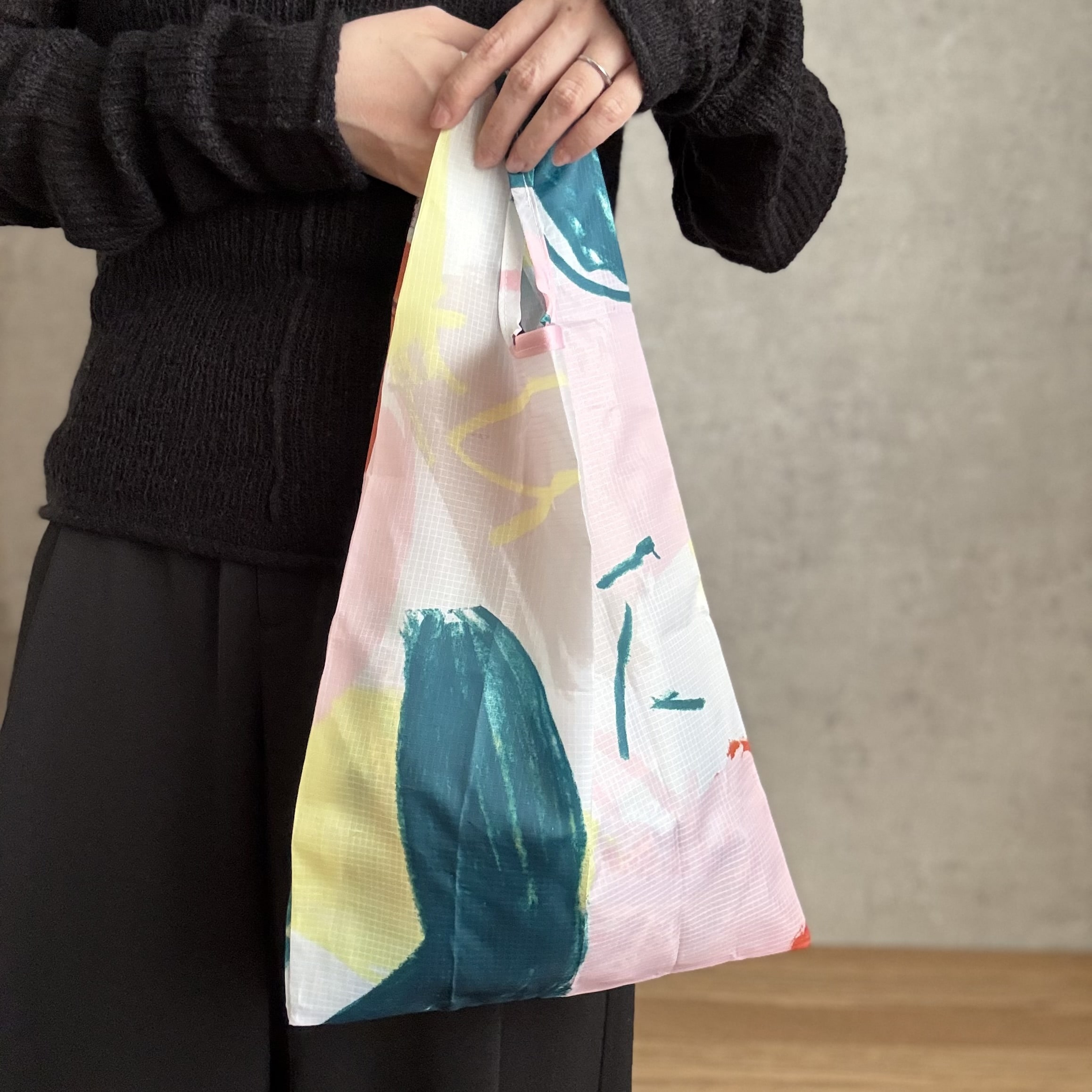 地味色コーデが多いから、こういう差し色になるようなエコバッグがあると気分がちょっと上がります〜