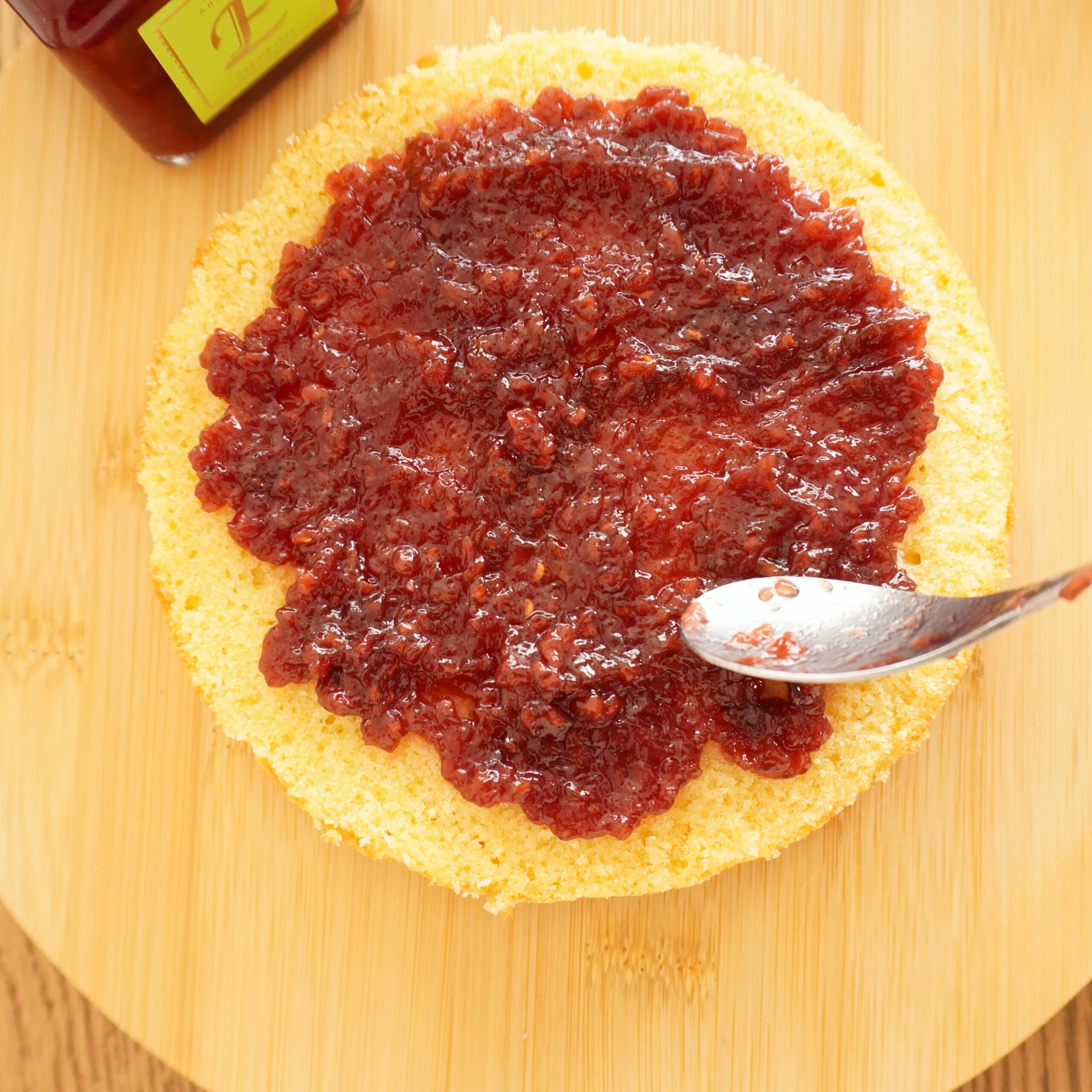 スポンジを半分にカットして、ジャムを塗り塗り。acchaちゃんからいただいたジャムがとっても美味しくて味見が止まらない。