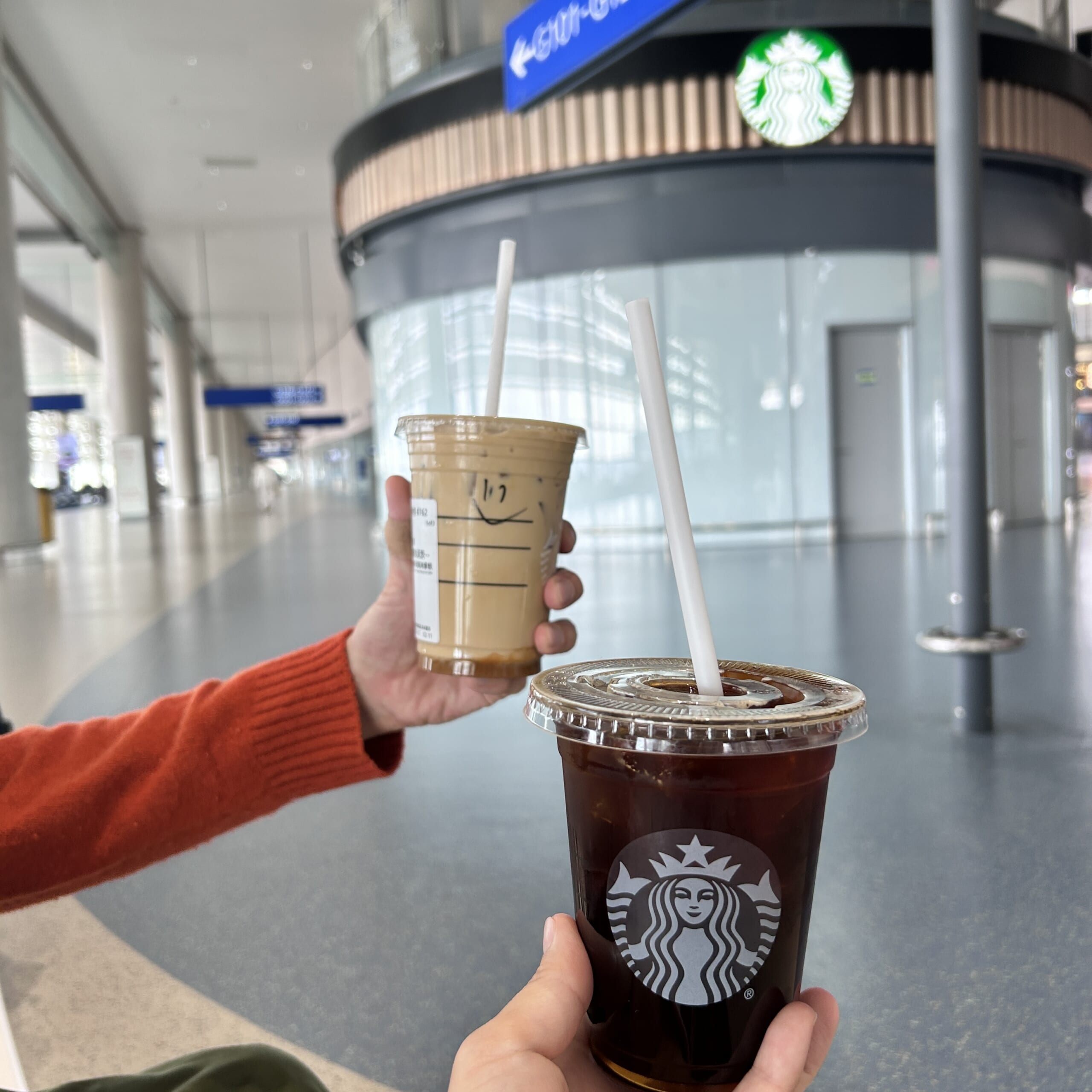 往路は2時間半くらいの待ち時間。娘もお昼寝していたのでスタバ休憩。