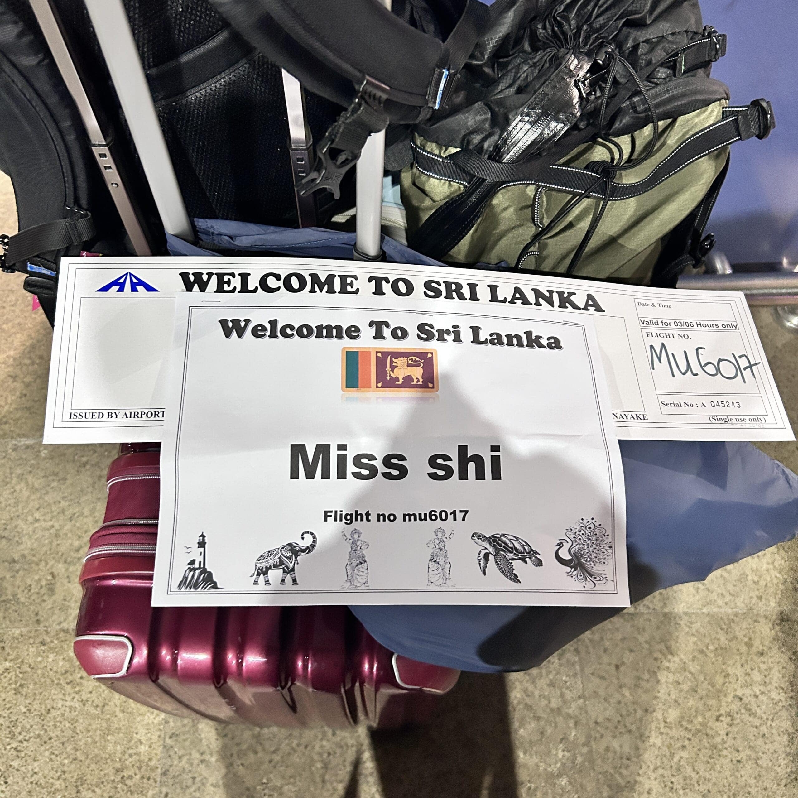そしてこんな感じで待ってるね。と送られて来たのが、この「WELCOME TO SRI LANKA Miss Shi」の写真。