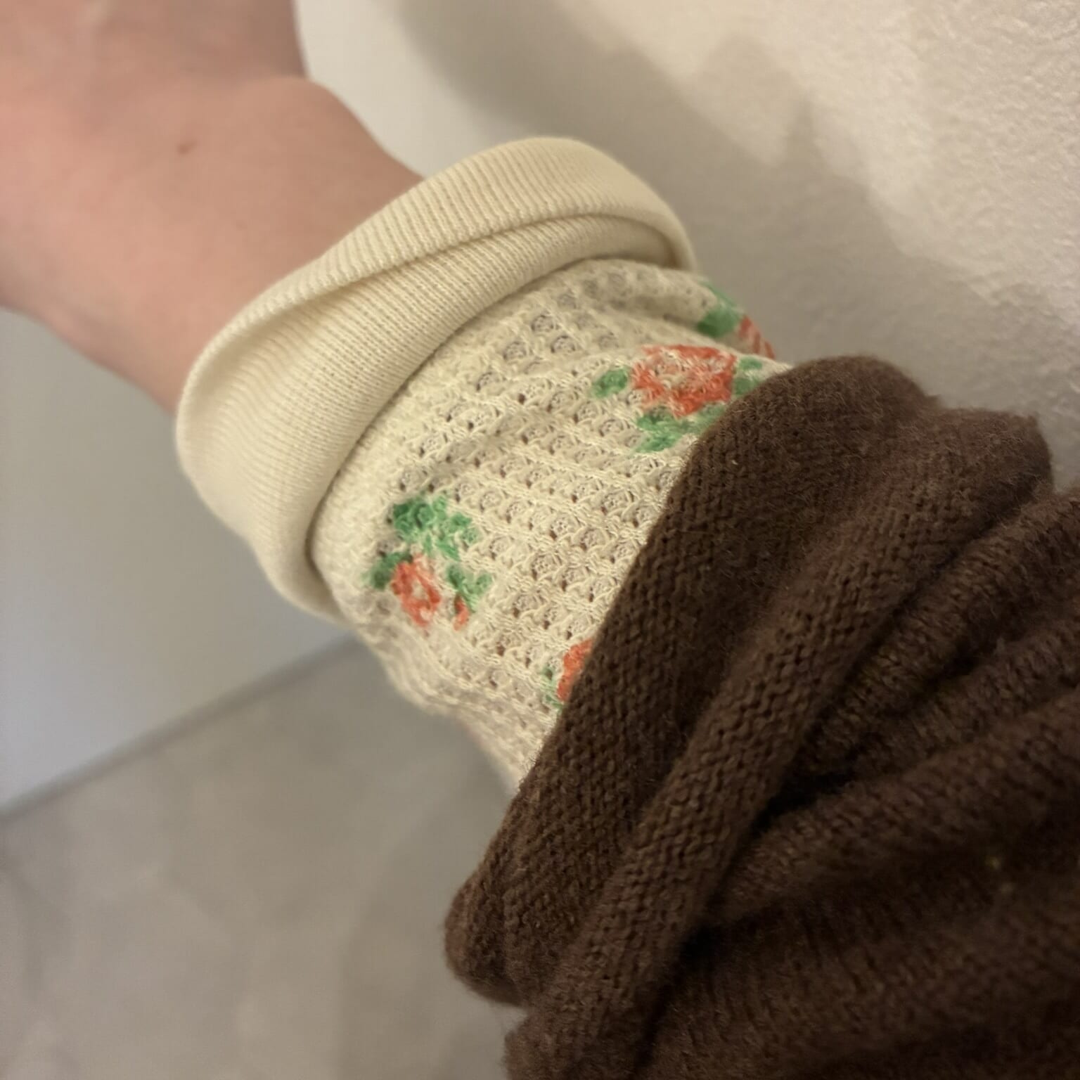 アラフィフにはサーマル1枚の姿は少々カジュアルすぎるため、こうしてレイヤードスタイルで楽しんでいます。ニットの裾や袖からちらりと小花柄をのぞかせるだけでなんだか新鮮♫春ムード。
