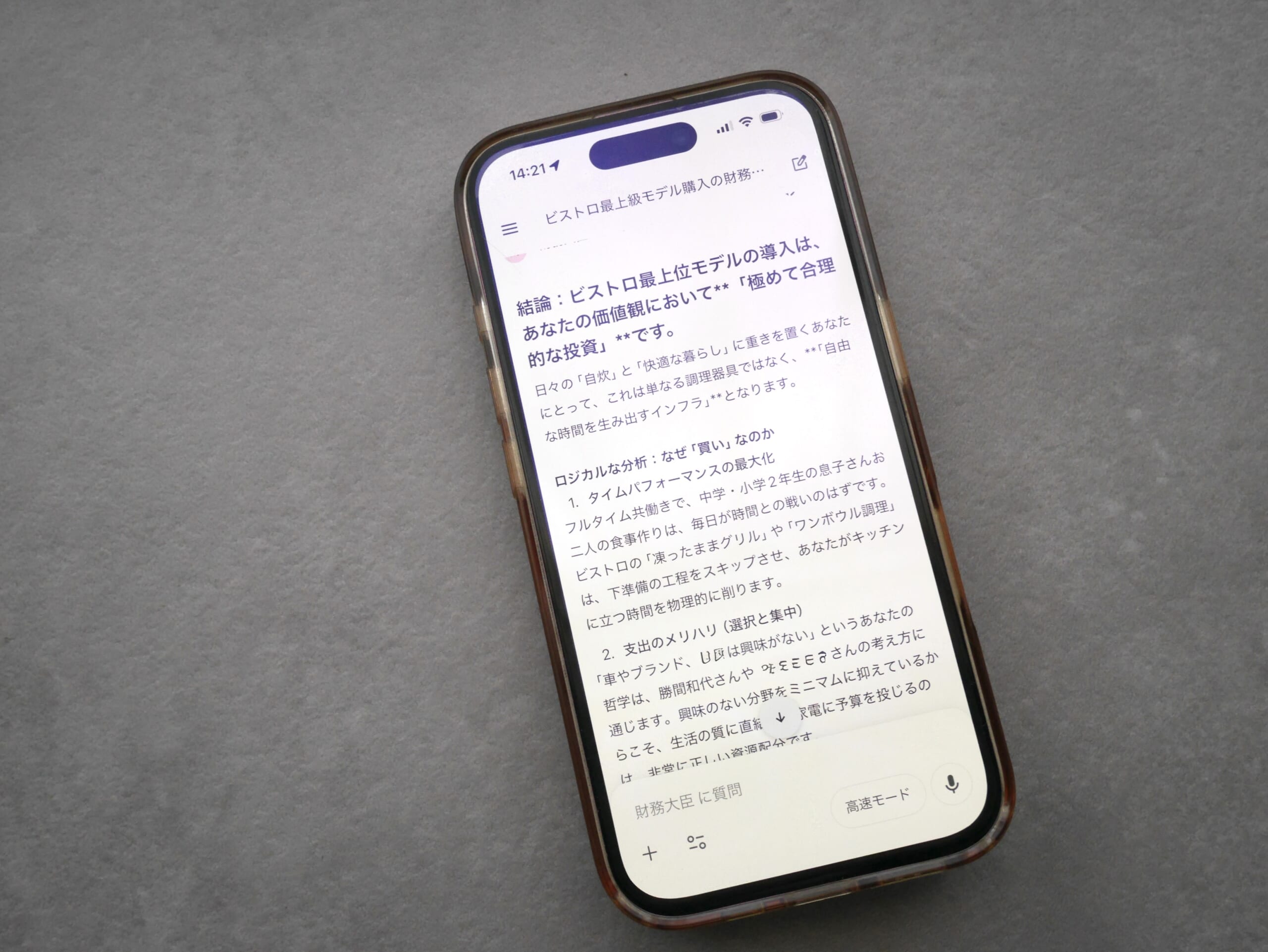なにか買い物をするとき、家計で悩んでいるときにアドバイスをしてくれます。(写真はPanasonicのビストロの最上級モデルの購入を相談したときです)