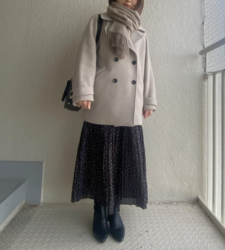 スカートも白地にドットのものにして、思い切り春配色に。ユニクロのヒートテックリブタイツにショートブーツでしっかり防寒しています!