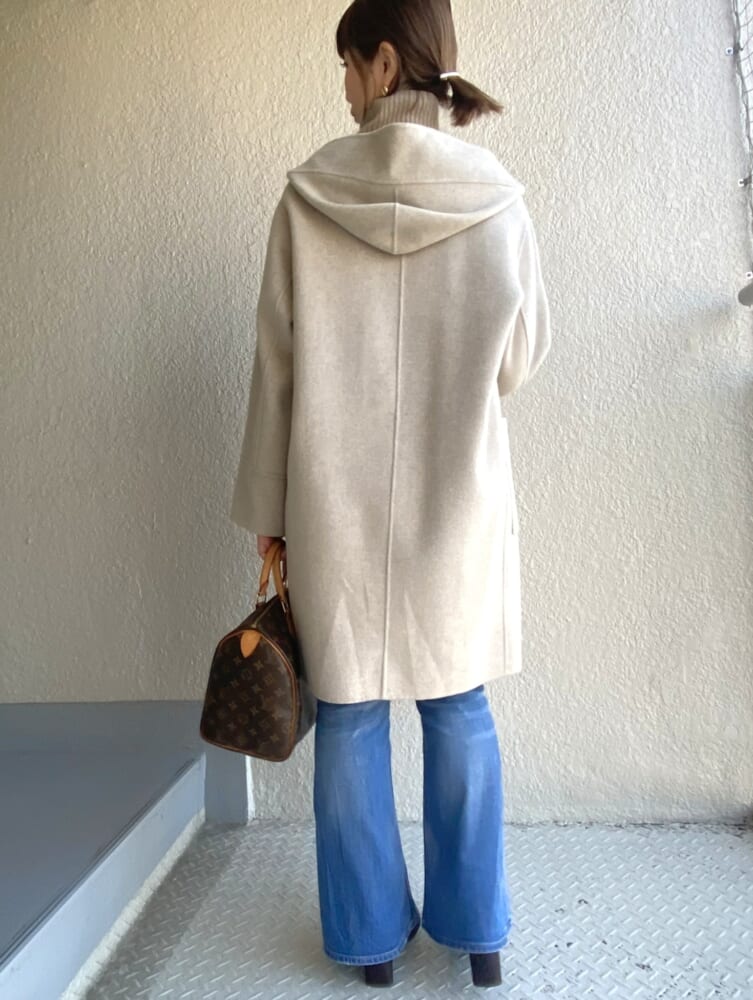 もともとベージュという色が好きで、アウターもいくつか持っているのですが、このコートは黄みの少ない明るいベージュなので特に2月~3月に特に活躍します。それになんとなくフードのついたアイテムって、春を感じませんか?ボーダーを中に着てカジュアルに見せたりもできるので、気に入っています。