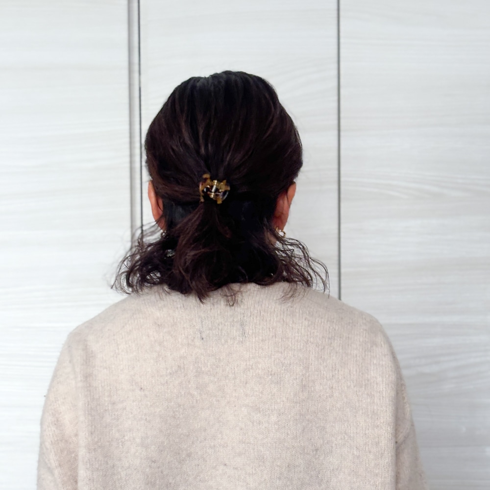 そんな時は潔く諦めて、クリップでまとめてしまいます。手ぐしでまとめてクリップをつけるだけで、ニュアンスが出て様になるのがうれしい。
