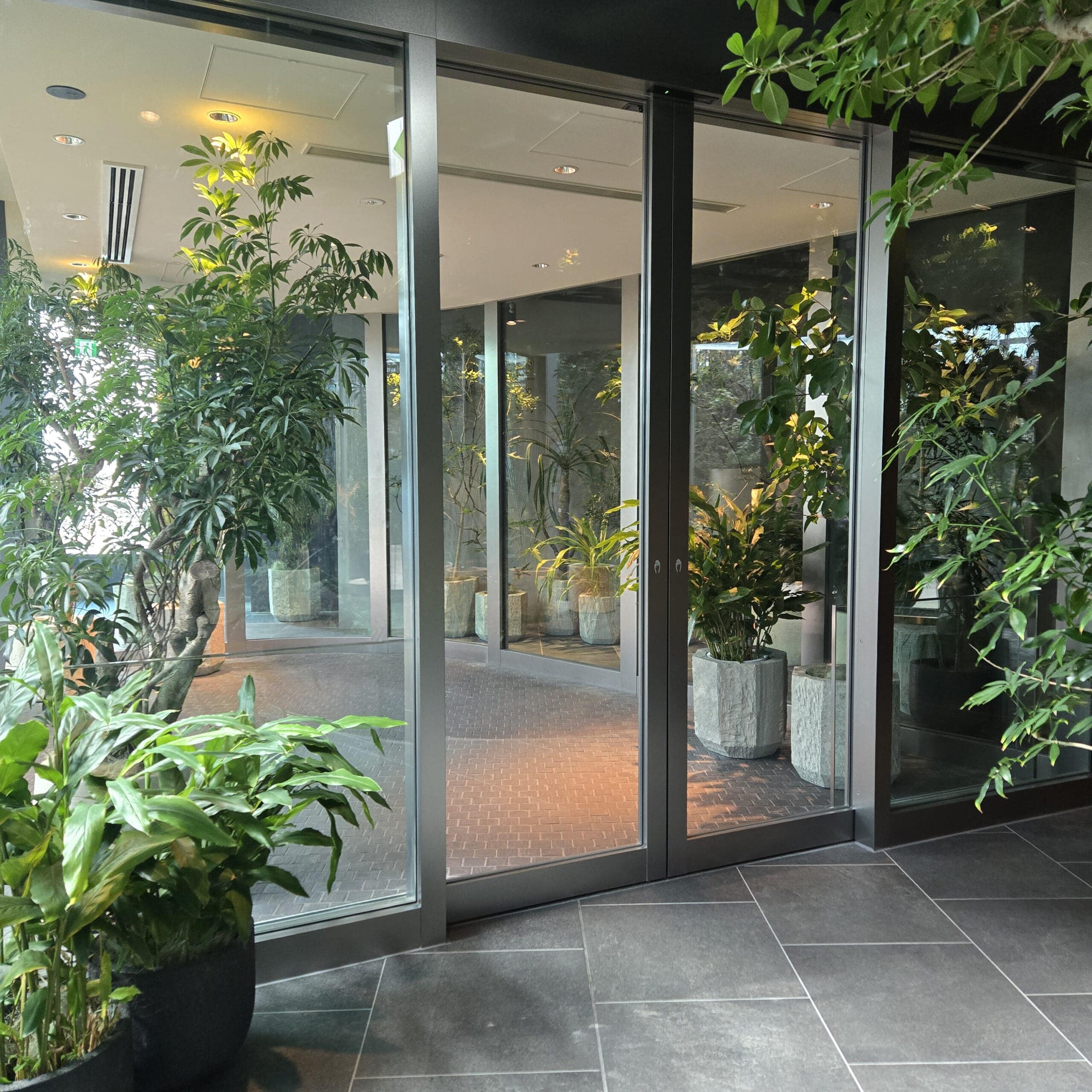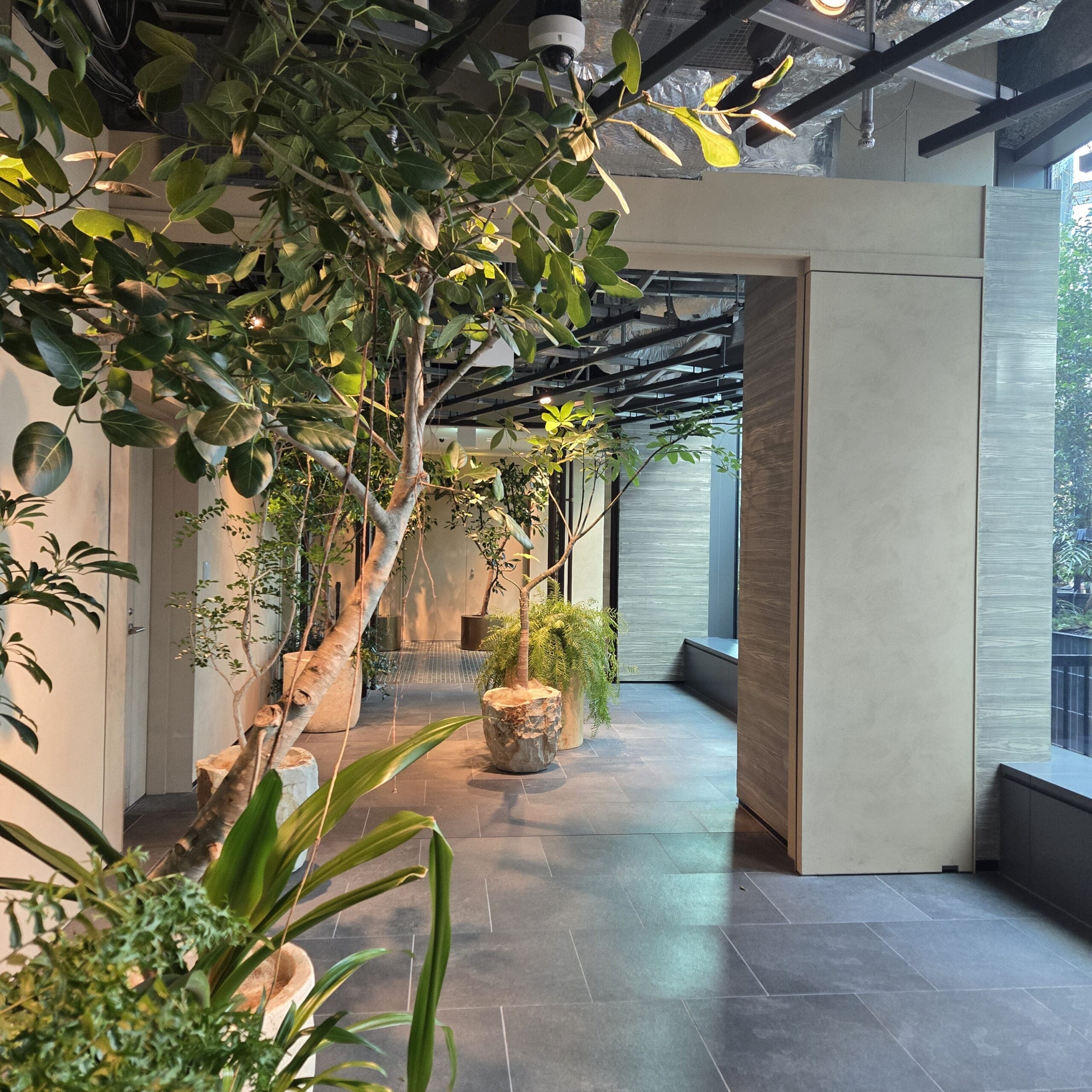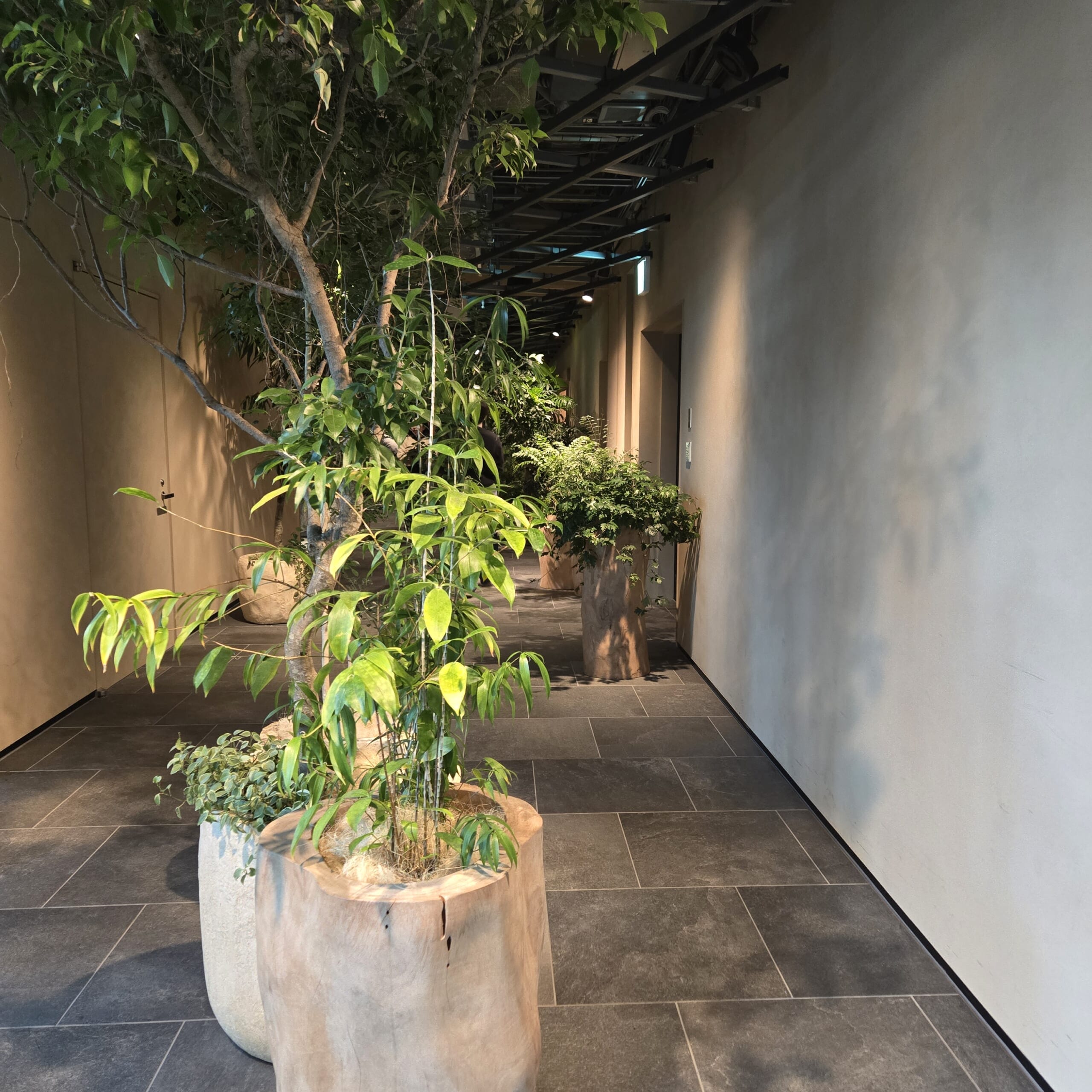 エレベーターを降りて角を曲がればすぐに緑がたくさんの通路。