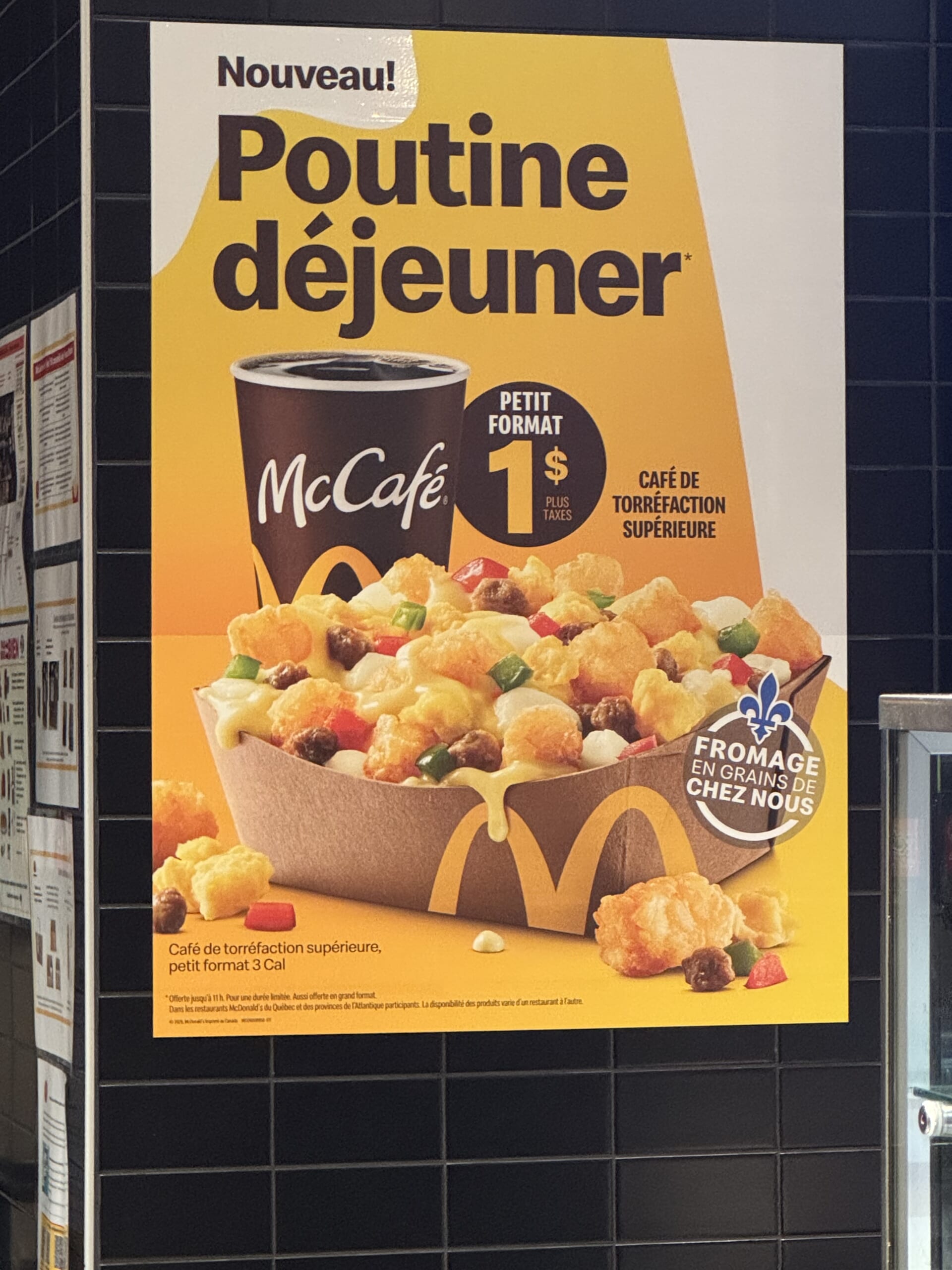ケベックの名物料理のプチーン、レストランで食べたら結構な量が出てきます。 フライドポテトにヘビーなソースがかかったこの料理、胸焼け必須。 マクドナルドでサクッとお試しするのがおすすめです。