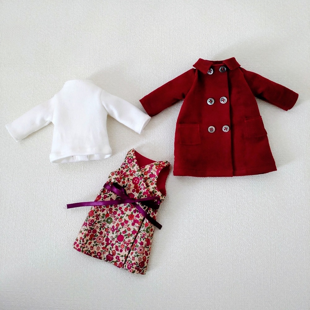 赤いコートはCHECK&STRIPEさんのオリジナル布、フレンチコーデュロイのベリー、ワンピースはリバティプリント、カットソーは白の天竺がセットされています。