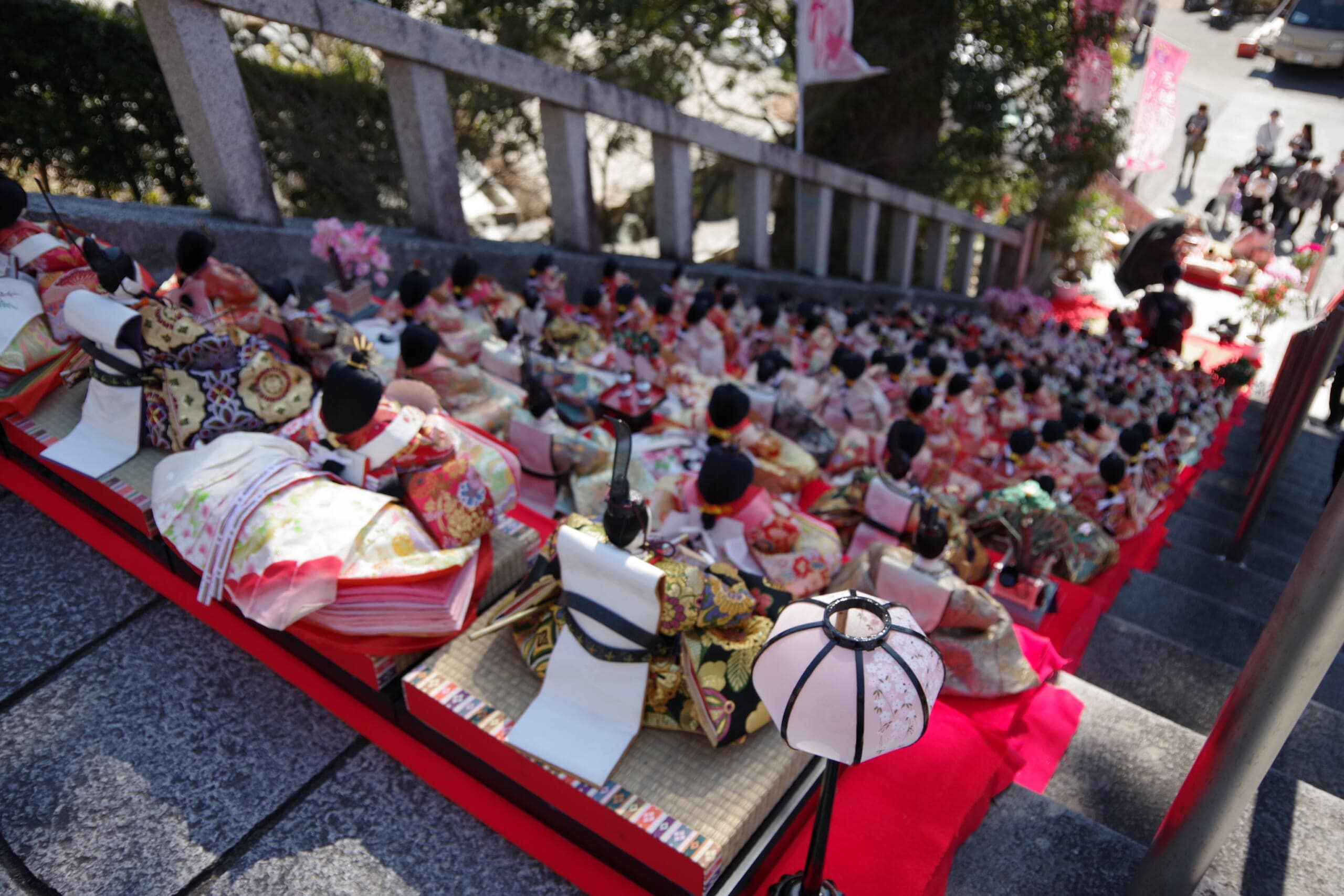 はじめにみえてくるのは山門前の外階段に並ぶお雛様御一行。